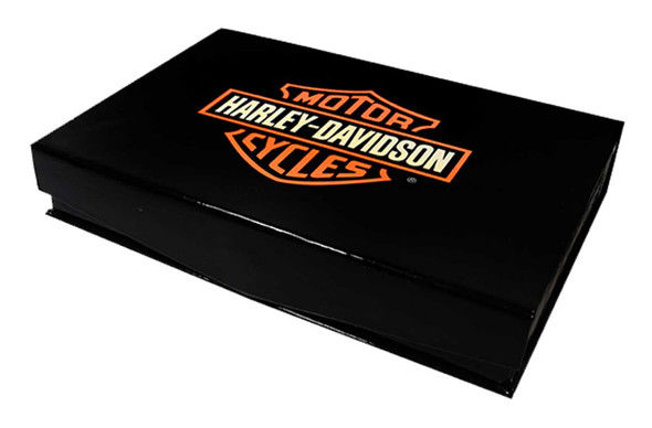 Harley-Davidson® Bar & Shield Collector Pin Set, 8014957. Box set features five nickel plated, 1.25" hard enamel Bar & Shield pins in classic orange, red, green, blue and purple. The pins are held securely in laser cut foam with printing on the inside lid for an attractive display. Box is magnetic close and comes with a protective sleeve. Highly collectible!