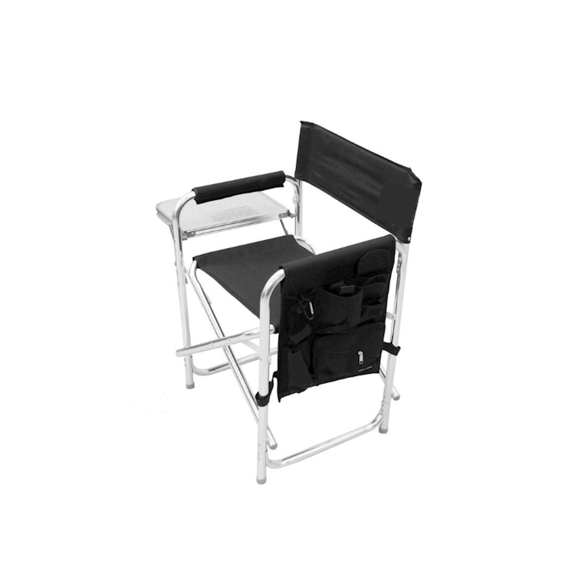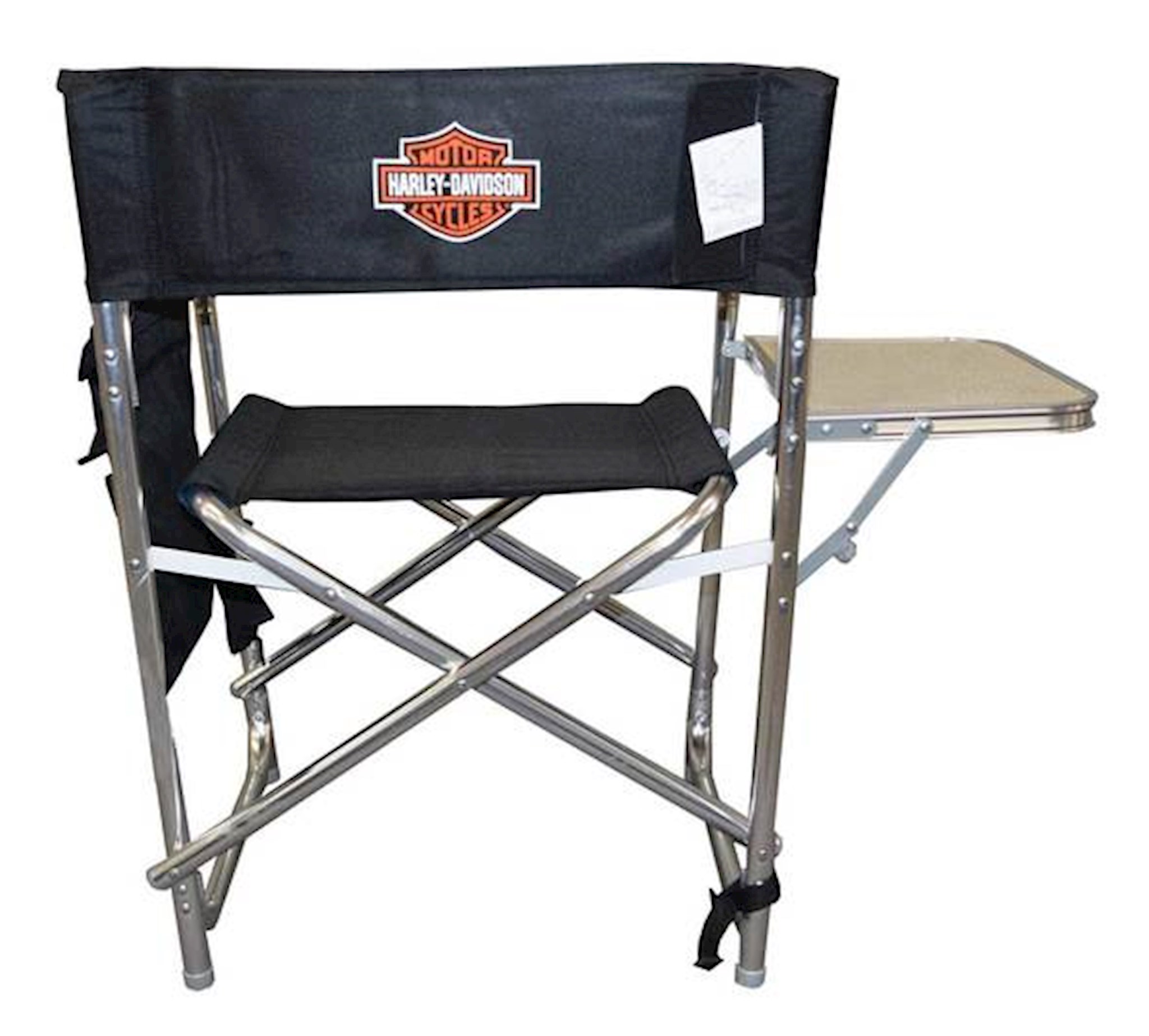 Harley-Davidson® Fold-able Sports Chair. Features a Bar & Shield Logo. Made from a lightweight aluminum frame. Detachable polyester armrest caddy with tons of storage. Can hold up to 300 lbs. Seat is 19.5'' wide and sits 16.5'' off the ground. Features 2 durable strips of webbing sewn into the underside of the seat for carrying handles. Adjustable and detachable shoulder strap. Has a fold-out side table to hold food or drinks, can hold up to 10 lbs. Comes with a insulated beverage pouch and a zippered security pocket for you valuables. Size: 33'' x 5'' x 21''.