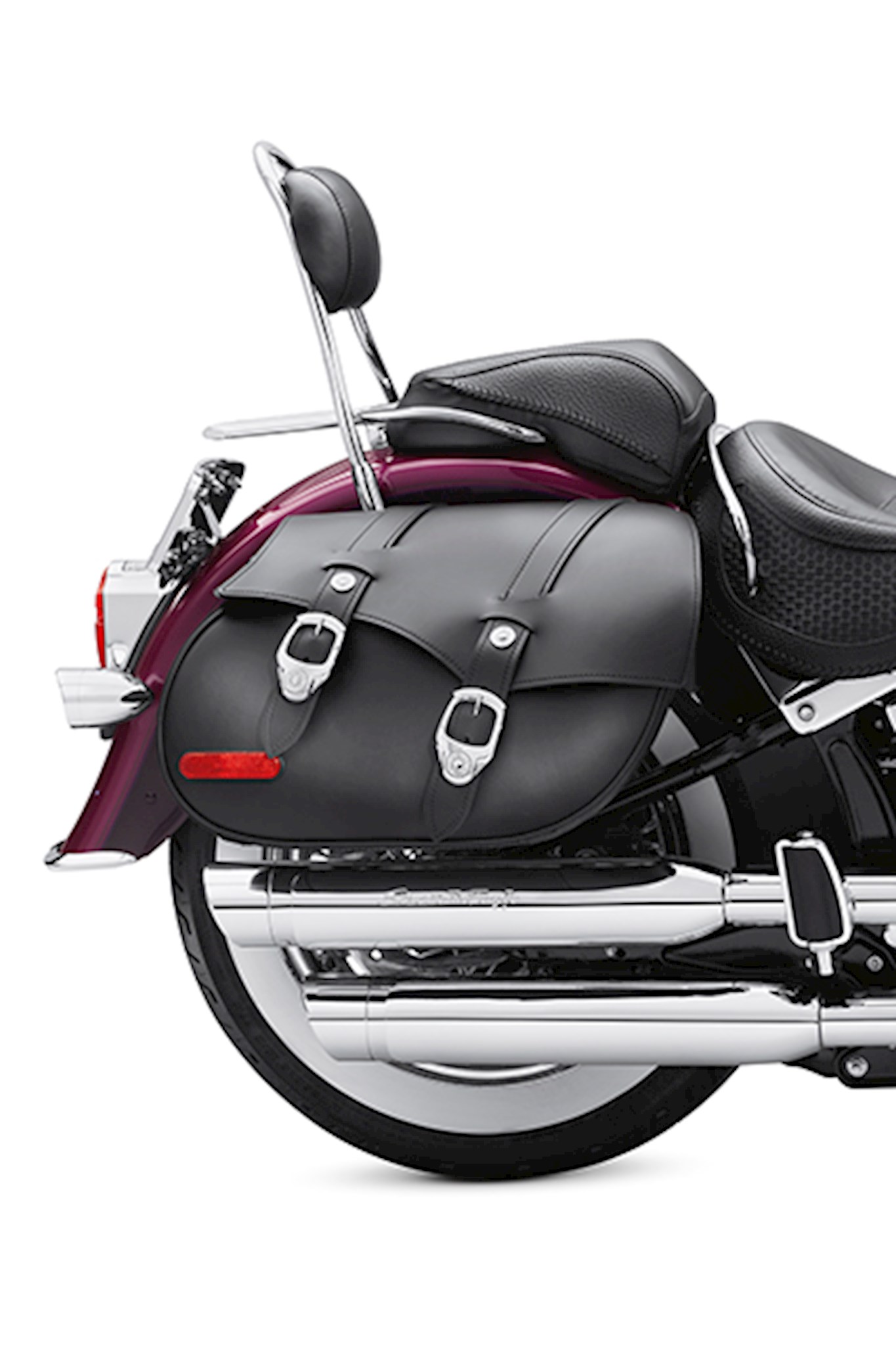 Carry your essentials in style with these premium heavy leather saddlebags. They feature a reinforced tub to retain their shape for the long-haul, leather straps that hide quick-release clips and a new chrome buckle to match the FXSTC seat buttons. They are also highly stylized with a smooth leather lid and decorative chrome spots to match the '07 Softail Custom model. Luggage capacity: 1500 cubic inches total.