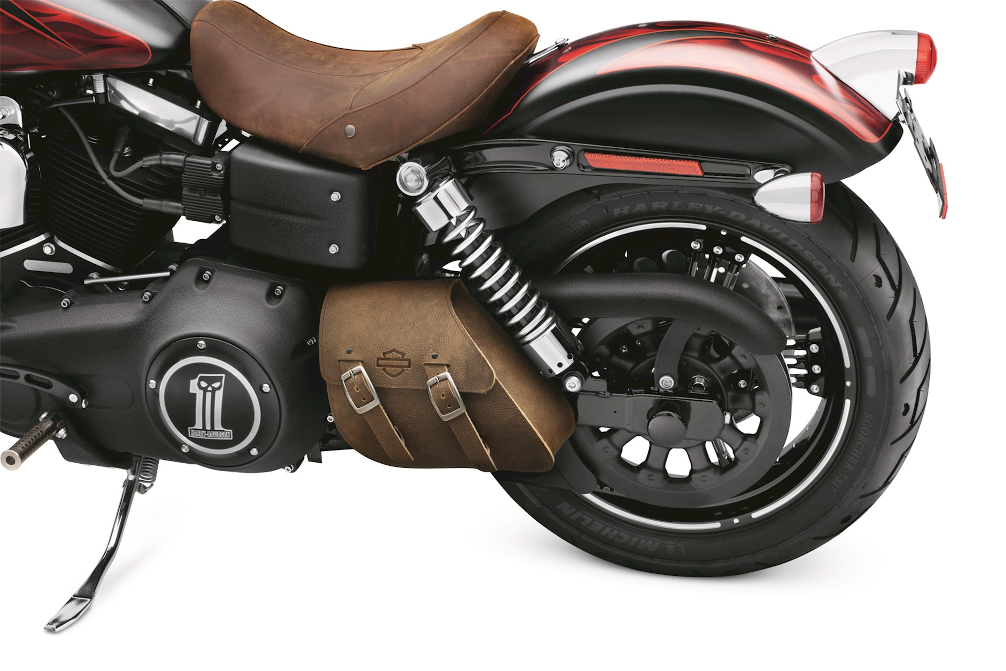 Less is more. With enough room for the essentials, these stylish Swingarm Bags eliminate the need to stuff your pockets or bungee a bag across the passenger pillion. Shaped to hug the contour of your bike's frame, these compact bags add an old school look. Bags are constructed of heavyweight leather and feature a pouch-style flap lid that is secured with two quick-disconnect clips that are hidden behind traditional straps and buckles. The semirigid-backed bag is secured to the left side of the bike with easy-to-install brackets and adjustable straps. Bag is available in your choice of rich black leather or brown distressed leather finish. Luggage capacity: 265 cubic inches total. Fits '06-later Dyna models (except FLD) equipped with Solo Seats. Requires removal of passenger pegs.