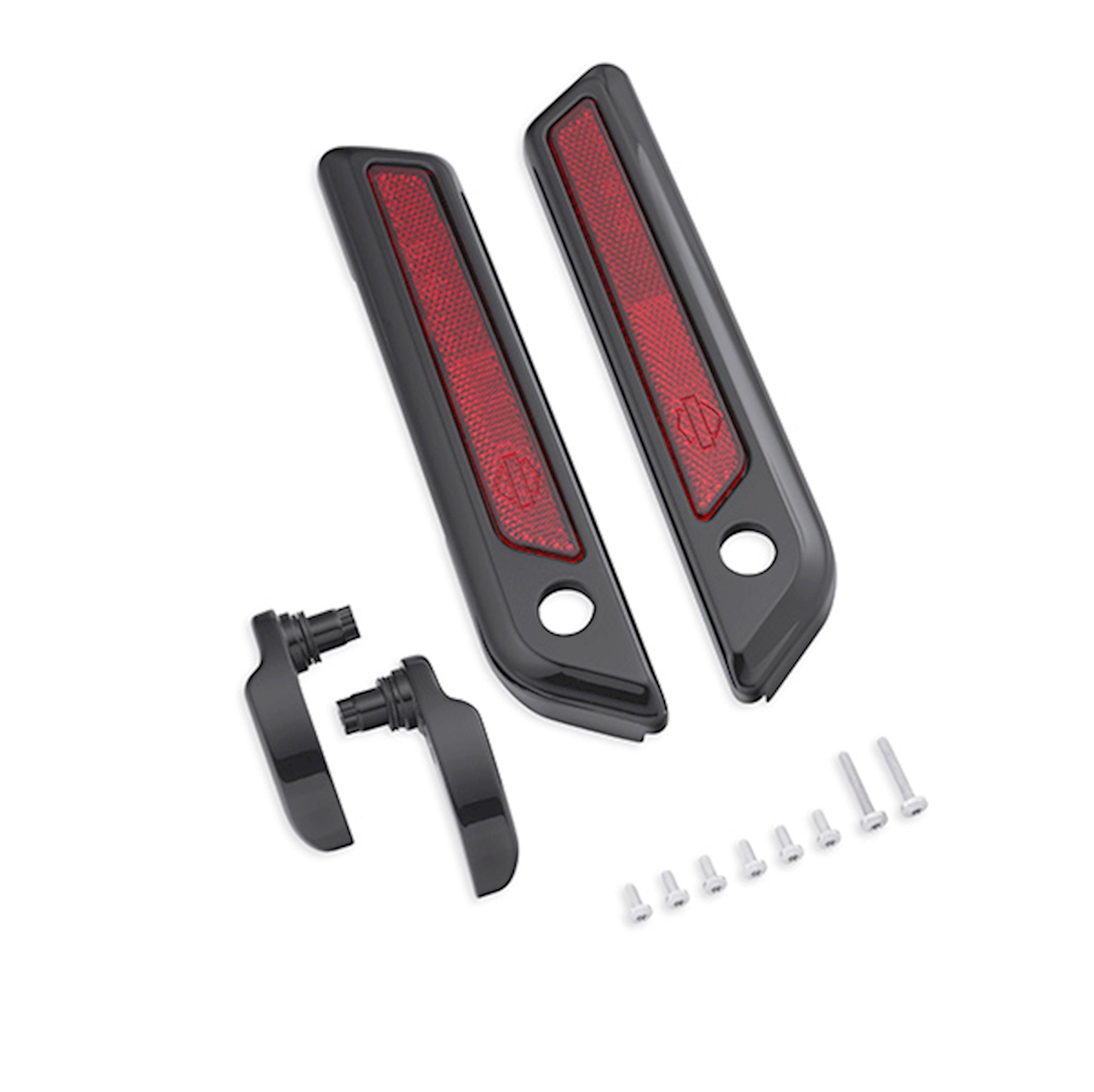 Gloss Black Saddlebag Hinge Covers and finger-operated Latches are an easy way to give your Touring bike a unique monochrome look. These latches add a dark custom touch to the motorcycles' s profile, and complement almost any paint combination. Easy to install with Original Equipment hardware and reflectors.