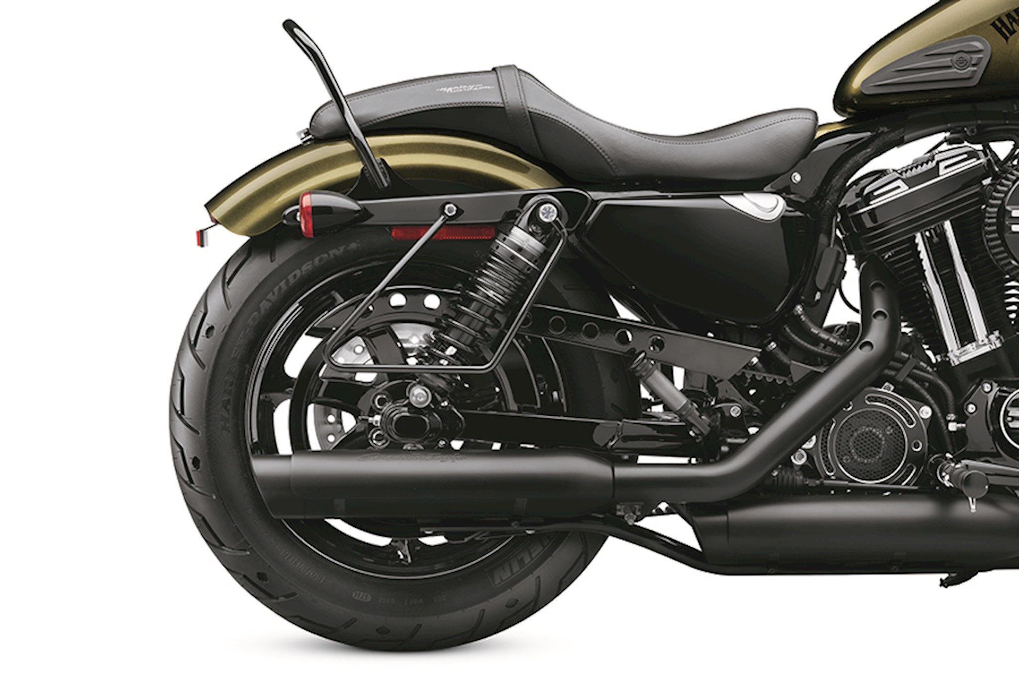 Keep your throw-over style saddlebags away from the wheel, swingarm and brake caliper. The elegant gloss black hoop attaches to the upper shock mount and fender strut, and can be installed on models equipped with rigid-mount sissy bar sideplates and uprights.