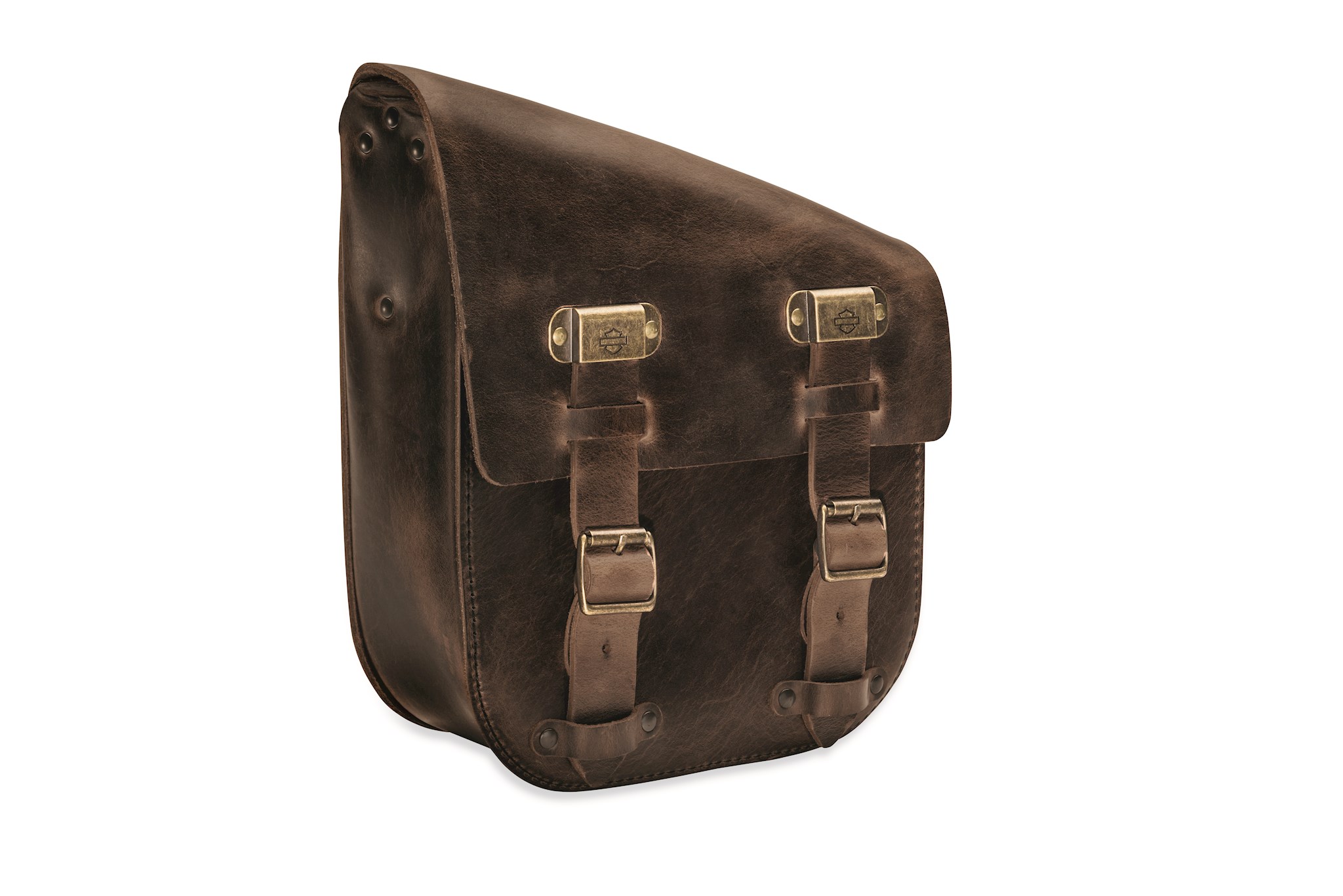 Less is more. With enough room for the essentials, these stylish Swingarm Bags eliminate the need to stuff your pockets or bungee a bag across the passenger pillion. Shaped to hug the contour of your bike’s frame, these compact bags add an old-school look. Bags are constructed of heavyweight leather and feature a pouch-style flap lid that is secured with two traditional straps and buckles. The semi rigid-backed bag is secured to the left side of the bike with easy-to-install adjustable straps. Luggage capacity: 450 cubic inches total. Crafted from supple brown pull-up leather tanned by Milwaukee's own Seidel Tanning Company, this classic Swingarm Bag will gain character and a well-worn authentic look with use. The flip-open lid is secured with traditional straps and buckles, and the bag features antique hardware that complements the old-school look.
