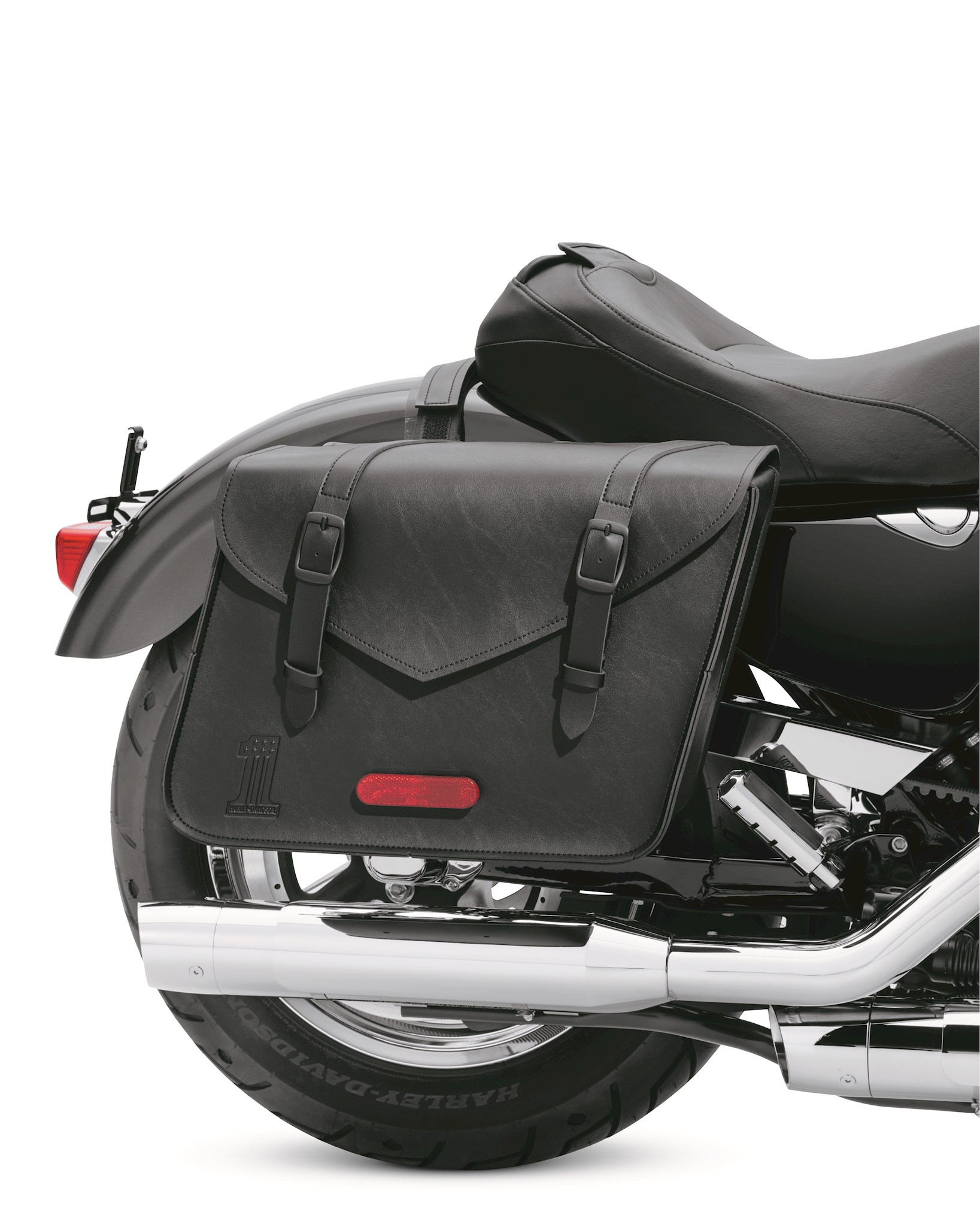 Made of ultra-durable leather-like synthetic featuring a debossed H-D #1 logo, the Black Standard Line Large Throw- Over Saddlebags have a simple, black on black style with a debossed Skull #1 logo that complements many styling directions and budgets. An internal reinforcement system maintains the bag’s shape over time. The MOLLE-style system of mounting loops accommodate hook and loop straps for versatility when mounting. These large throw-over bags are great for a run to the grocery store or a long-weekend excursion and feature matte black enamel buckles with hidden quick-detach closures. The bags measure 16.5" L x 11.5" H x 7" D. Internal capacity: 1,350CI. Weight capacity: 10 lbs/bag.