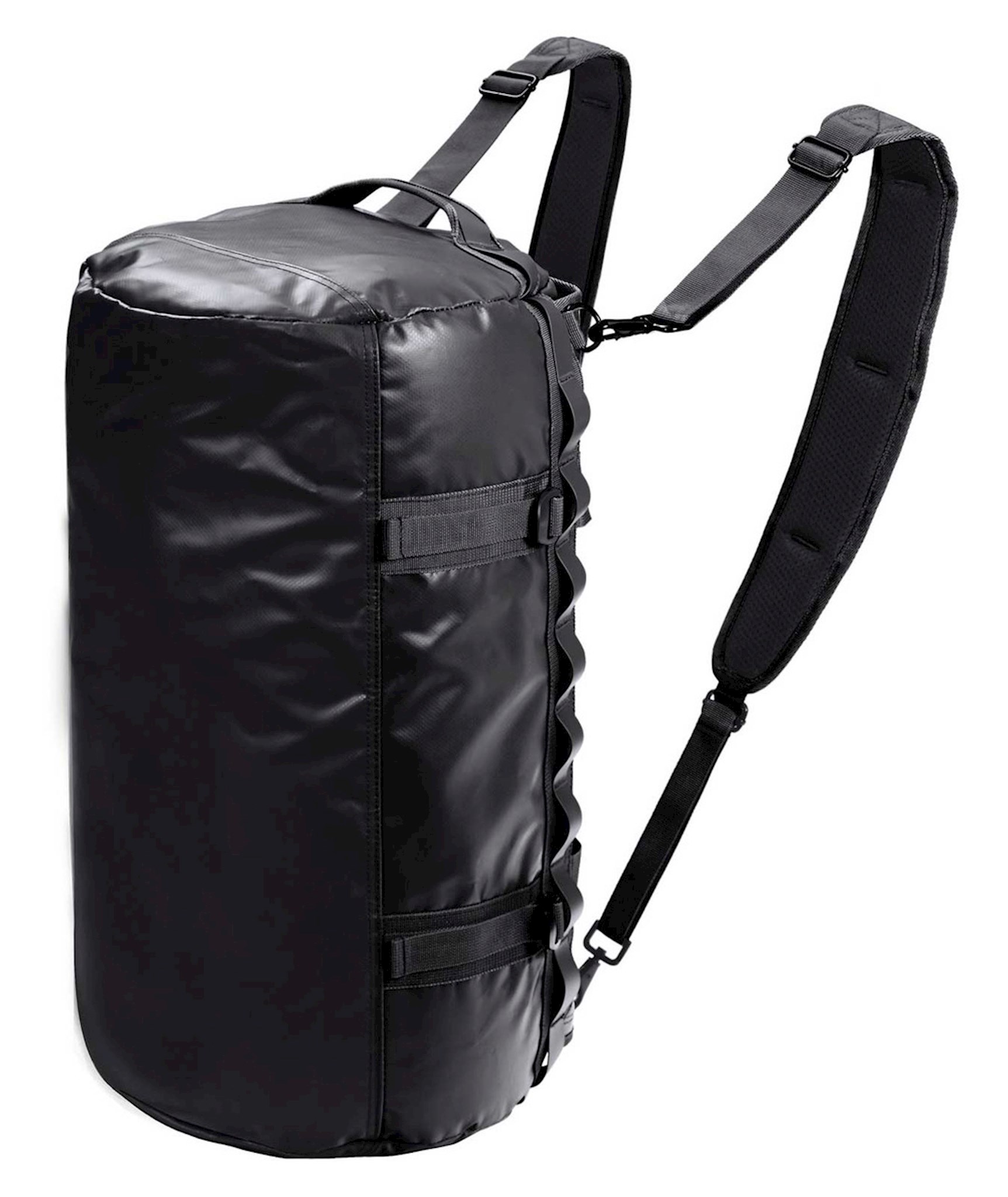 Versatile wear, carry as a duffel bag or wear as a backpack. Adjustable backpack straps lay flat on top of the duffel when not in use. Water-resistant, high-performance TPE coated exteriors. Carry handle on top and sides for easy lifting. Size: 21" x 12" x 12".