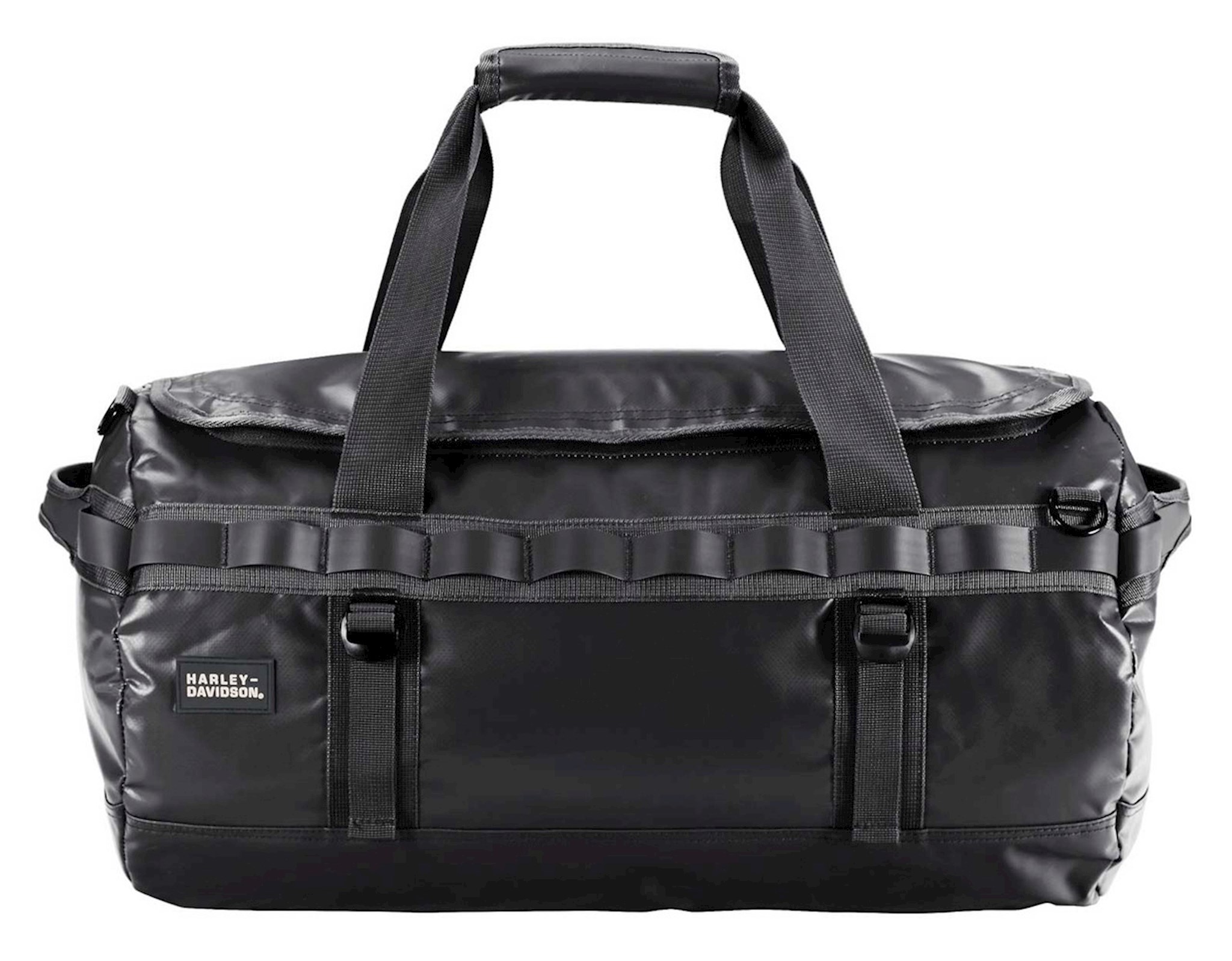 Harley-Davidson® Hybrid Duffel/Backpack - Black, 90328-BLK. Easy-to-go style with roomy interior to pack for trips. Versatile wear (carry as a duffel bag or wear as a backpack). Water-resistant, high-performance TPE coated exterior. Adjustable backpack straps lay flat on top of the duffel when not in use. Carry handle on top and sides for easy lifting. Stylish and functional accessory carry loops around the exterior of the bag. Side web straps. Size: 21" x 12" x 12". This bag can be carried on board most commercial airlines.