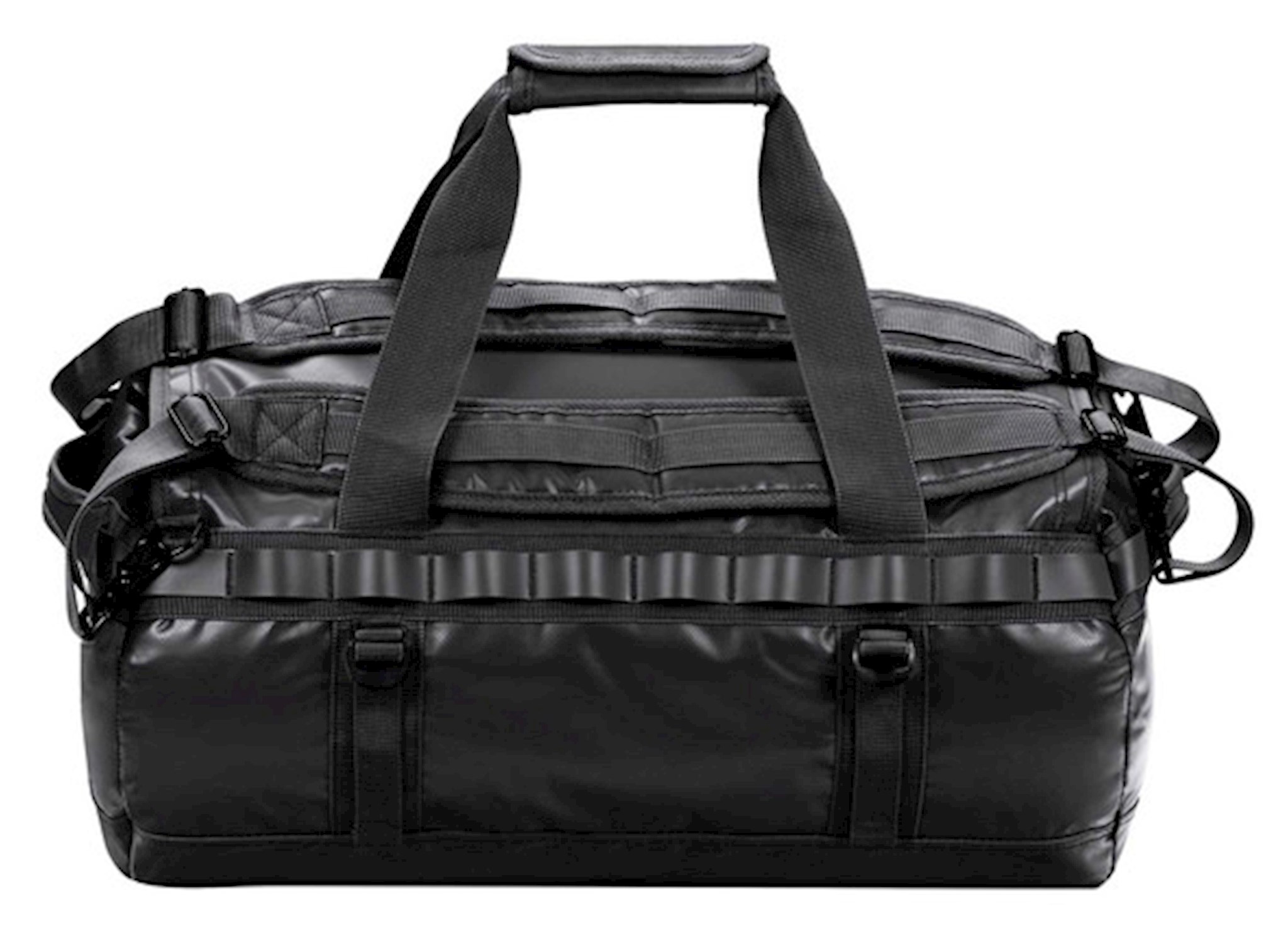 Versatile wear, carry as a duffel bag or wear as a backpack. Adjustable backpack straps lay flat on top of the duffel when not in use. Water-resistant, high-performance TPE coated exteriors. Carry handle on top and sides for easy lifting. Size: 21" x 12" x 12".