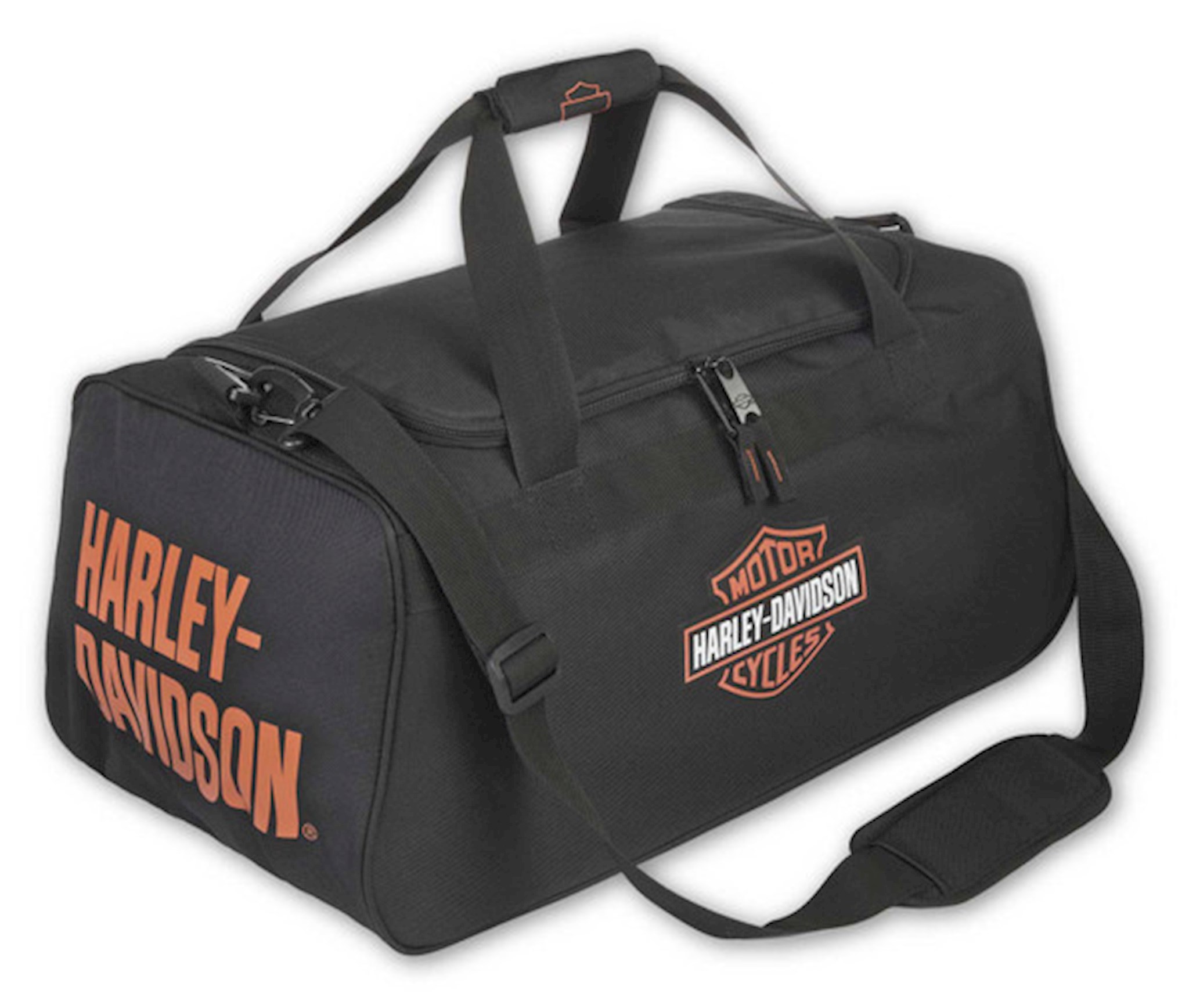 Harley-Davidson® Orange Bar & Shield Graphic Duffel Bag – Black, 90410-BLK/ORG. U-shaped zip-top opening for easy access with a spacious interior main compartment. Crafted from durable rugged, high density polyester material with self-bound piping. Removable shoulder strap for carrying comfort. Size: 20" x 10" x 9".