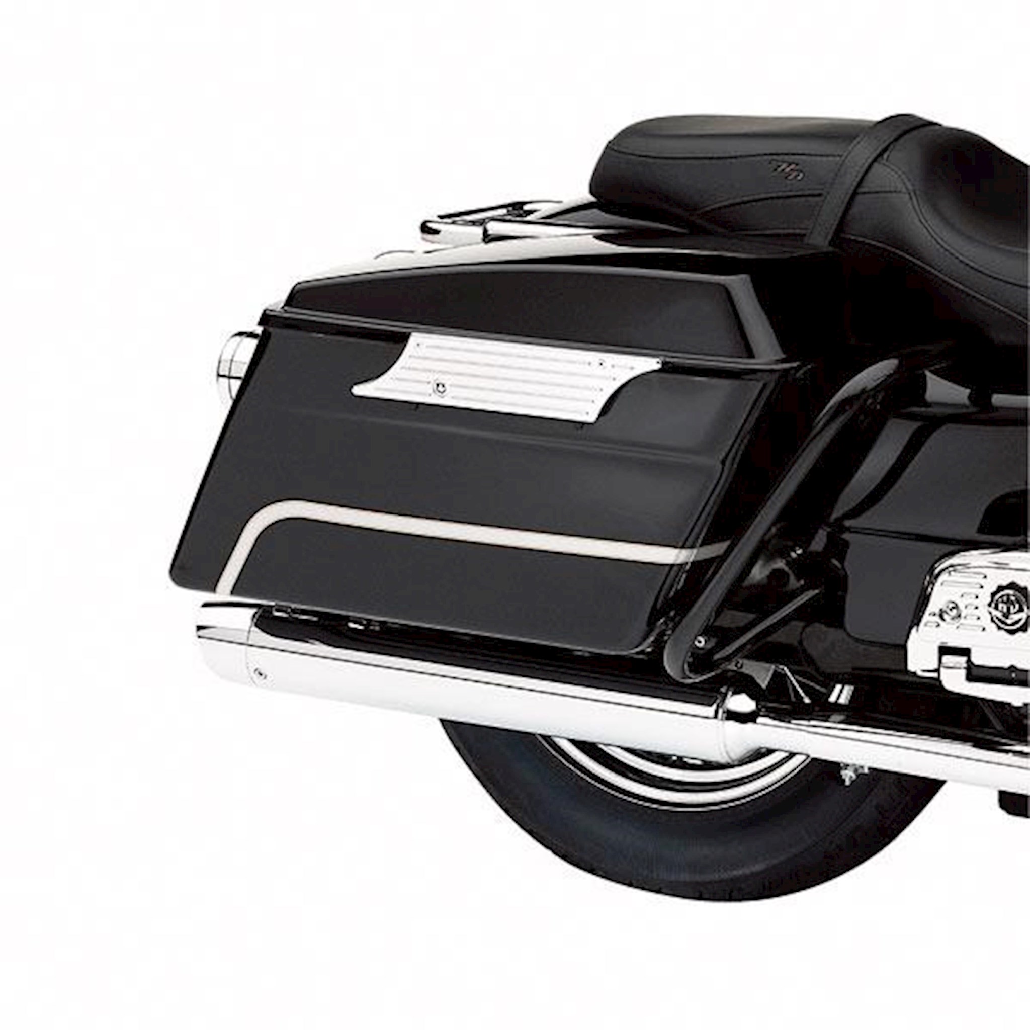 This sweep of chrome will set the tone for a very special Touring custom. Manufactured from billet aluminum, this polished and plated cover replaces the Original Equipment saddlebag hinge for a striking look. The grooved "ball-milled" design and curved leading and trailing edge add a feeling of forward motion, even while parked on Main Street. Kit includes chrome-plated mounting hardware and red saddlebag-mounted reflectors.