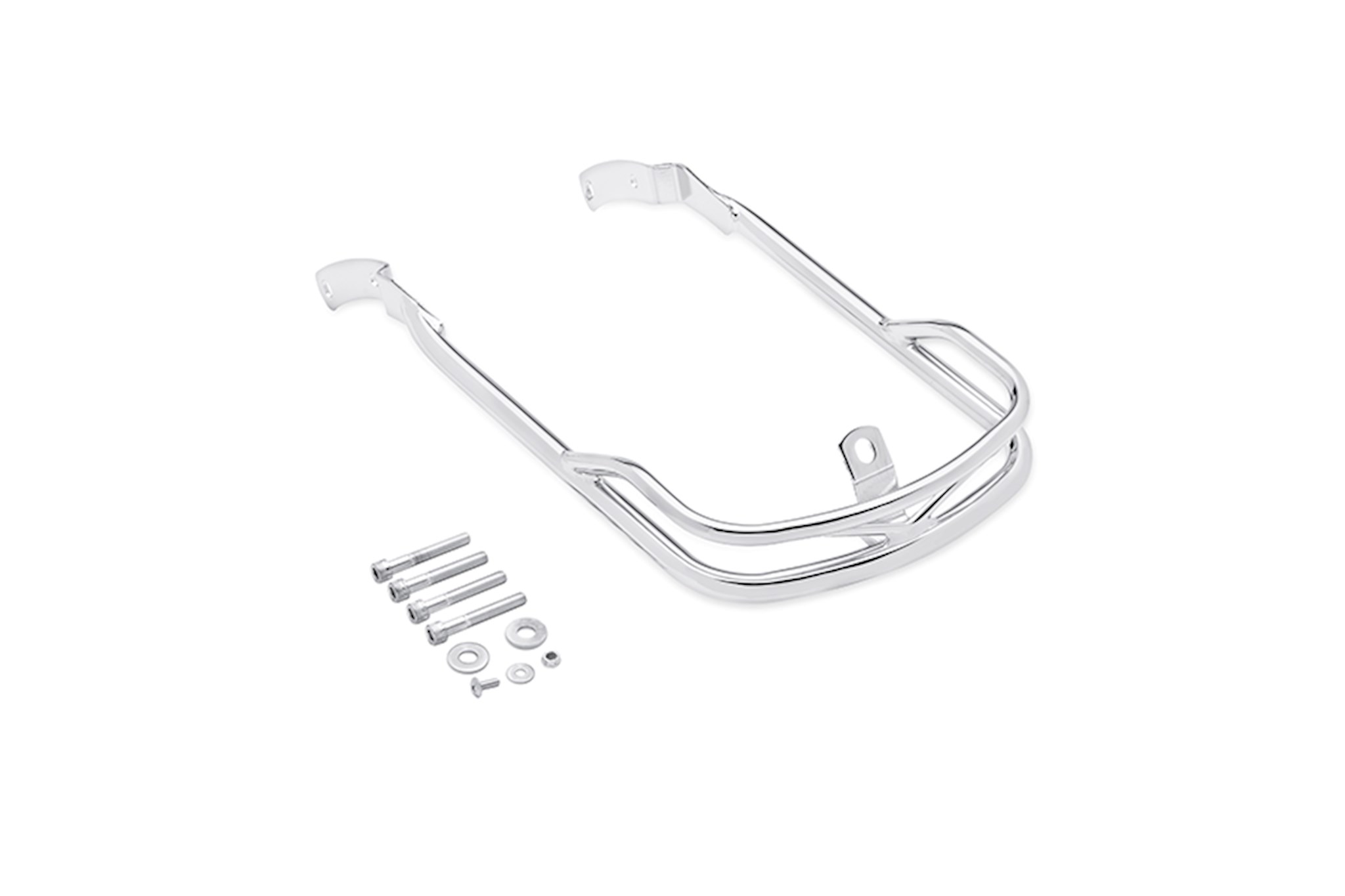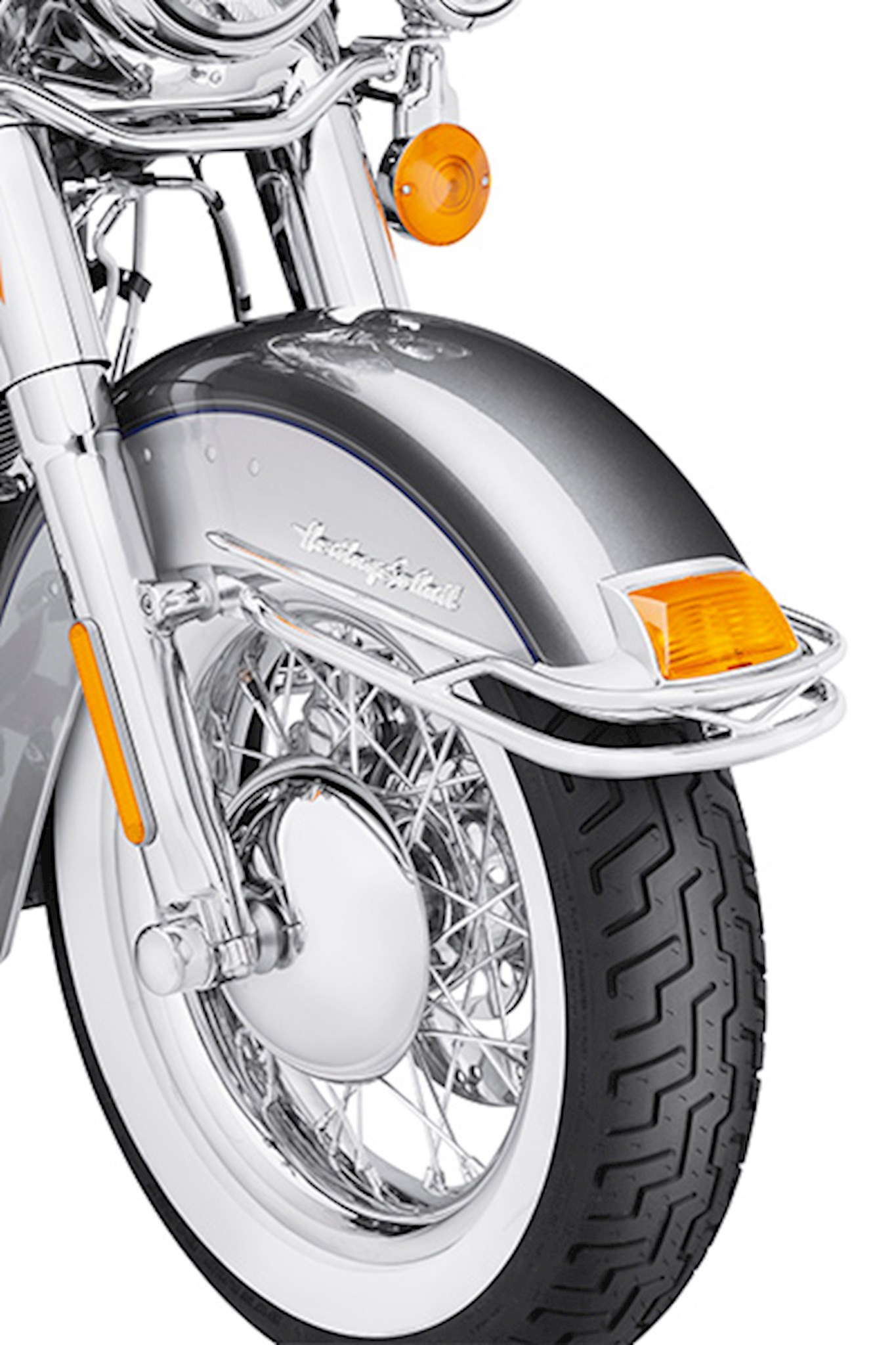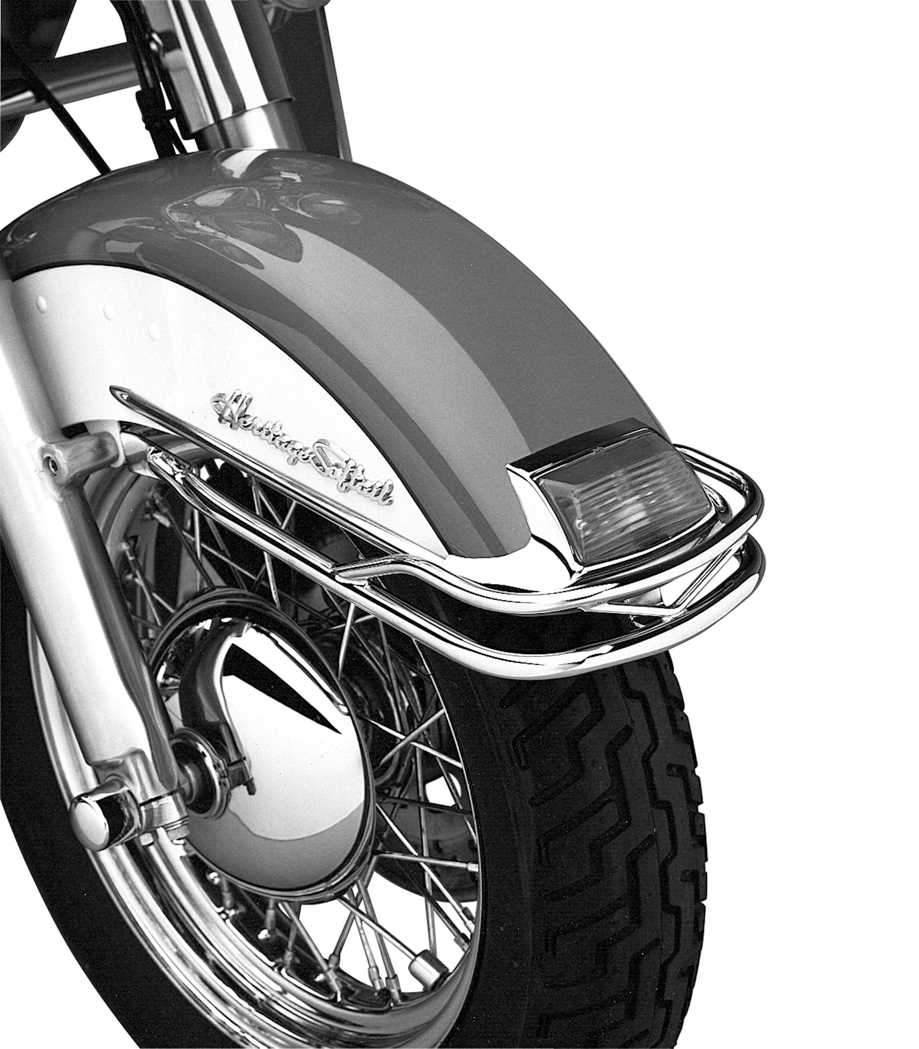 A stylish re-creation of a popular Hydra Glide model accessory direct from the Harley-Davidson® 1959 accessories catalog. Ornate, jet, twin-tube design sweeps smartly back along the front fender. Sparkling chrome-plating and years-ahead styling make it a hit for all Heritage and FLSTN owners.