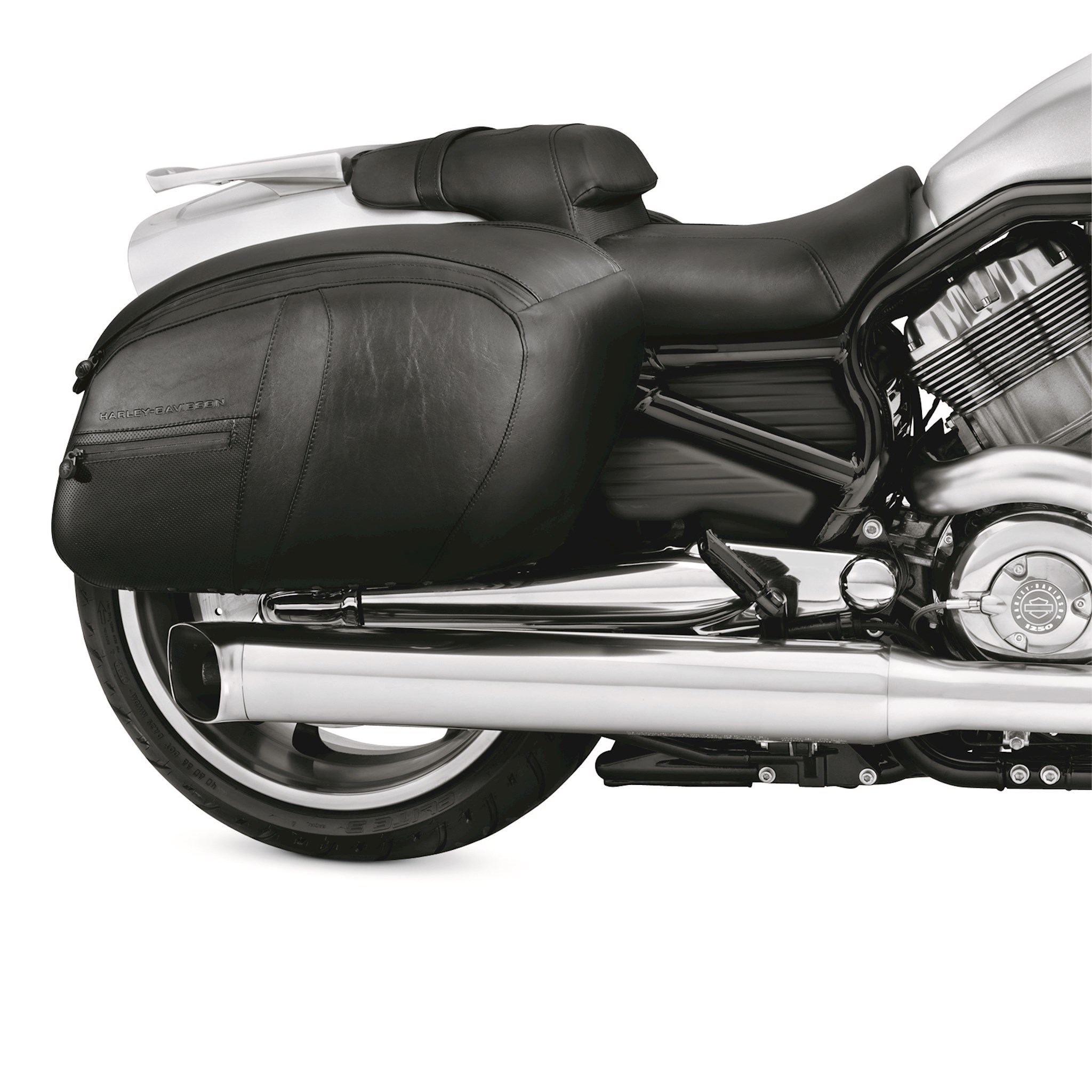 Maximize your touring capabilities with these extra-large capacity saddlebags without detracting from the sleek styling of the VRSCF model. These saddlebags feature a molded synthetic tub wrapped in durable vinyl with perforated vinyl accents to match the Original Equipment seat. The large interior is accessed through an easy-to-open water-resistant zippered flap and the powerful magnetic catch holds everything in place. The complete kit includes all necessary hardware for installation of saddlebags and side-mount license plate. Luggage capacity: 2950 cubic inches total.