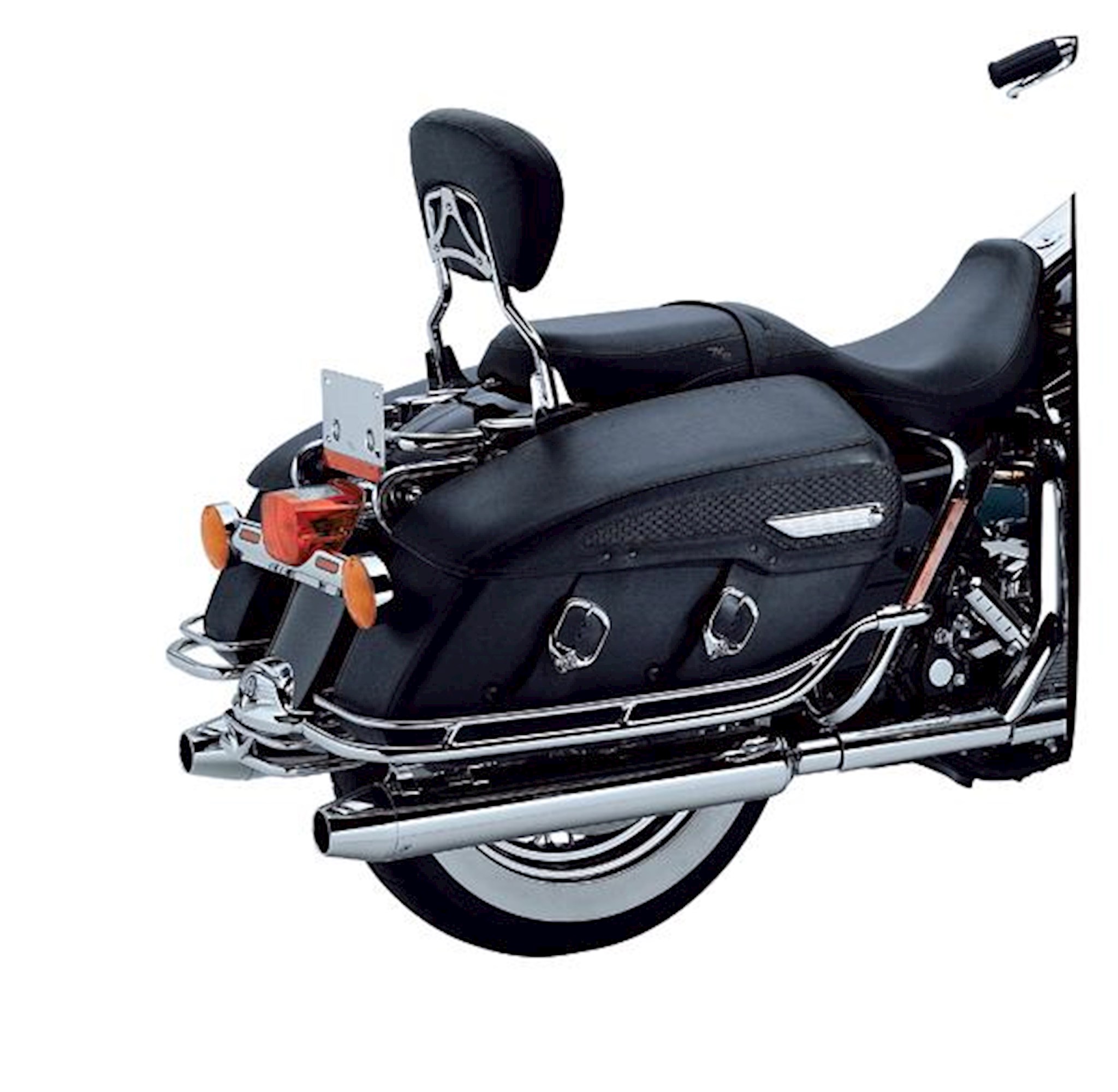Forge a link with the Panhead era by easily bolting on these Nostalgic Saddlebag Guard Rails. The soft curves of the nostalgic twin tube design hug the shape of the bag for a custom look, and the sturdy welded steel tubing is hand-polished and chrome-plated for a sparkling finish.