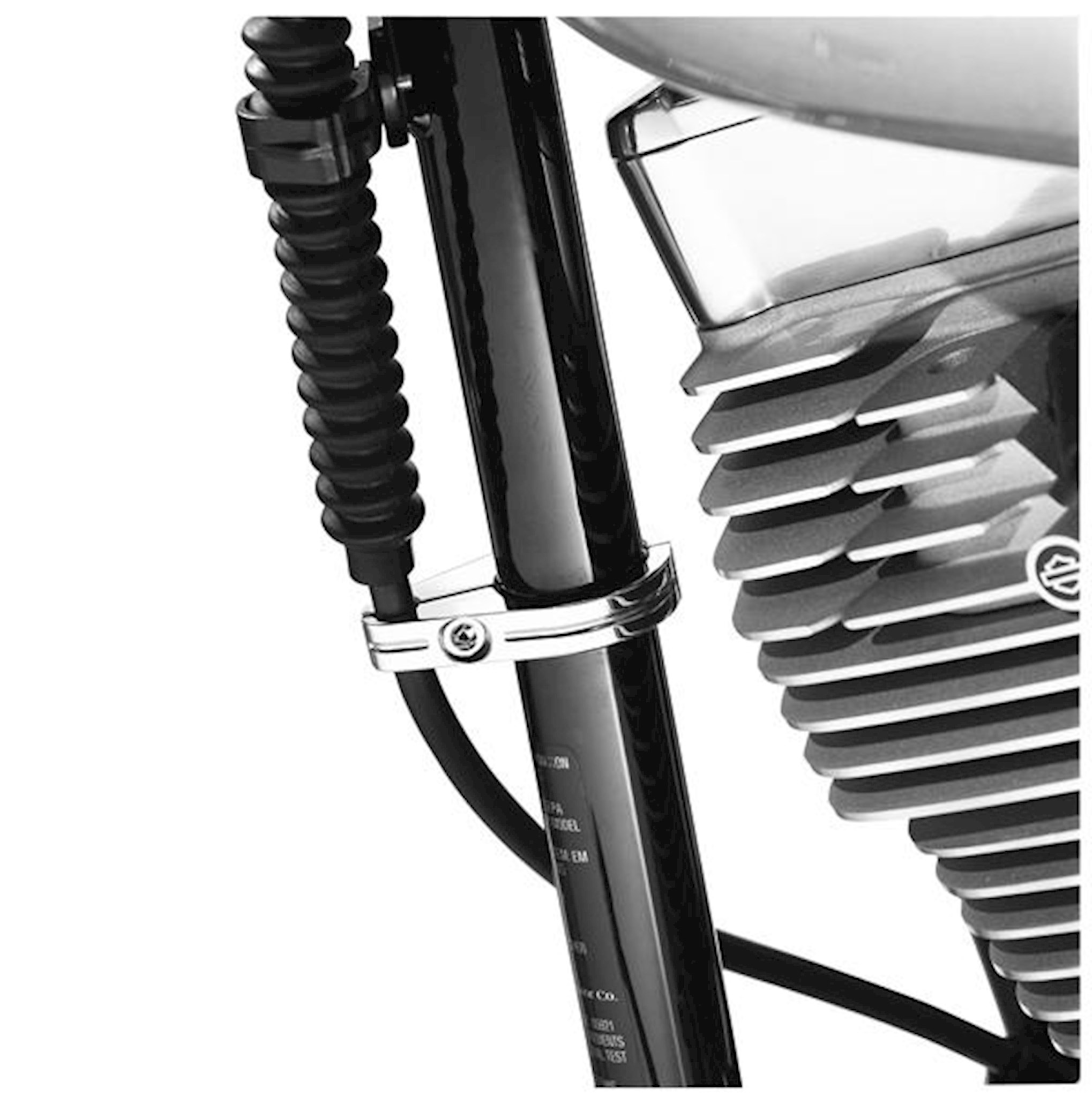 The perfect addition to braided or stock black clutch cables. The clamp is designed to grip the cable and the frame down tube, adding a custom look to the front of your cycle. This Clutch Cable Clamp is machined from aluminum billet and polished and finished for a lasting shine. Fits XL and Touring models with 1.375" diameter front frame downtube (except Touring models with hydraulic clutch or '14-later XL models with ABS).