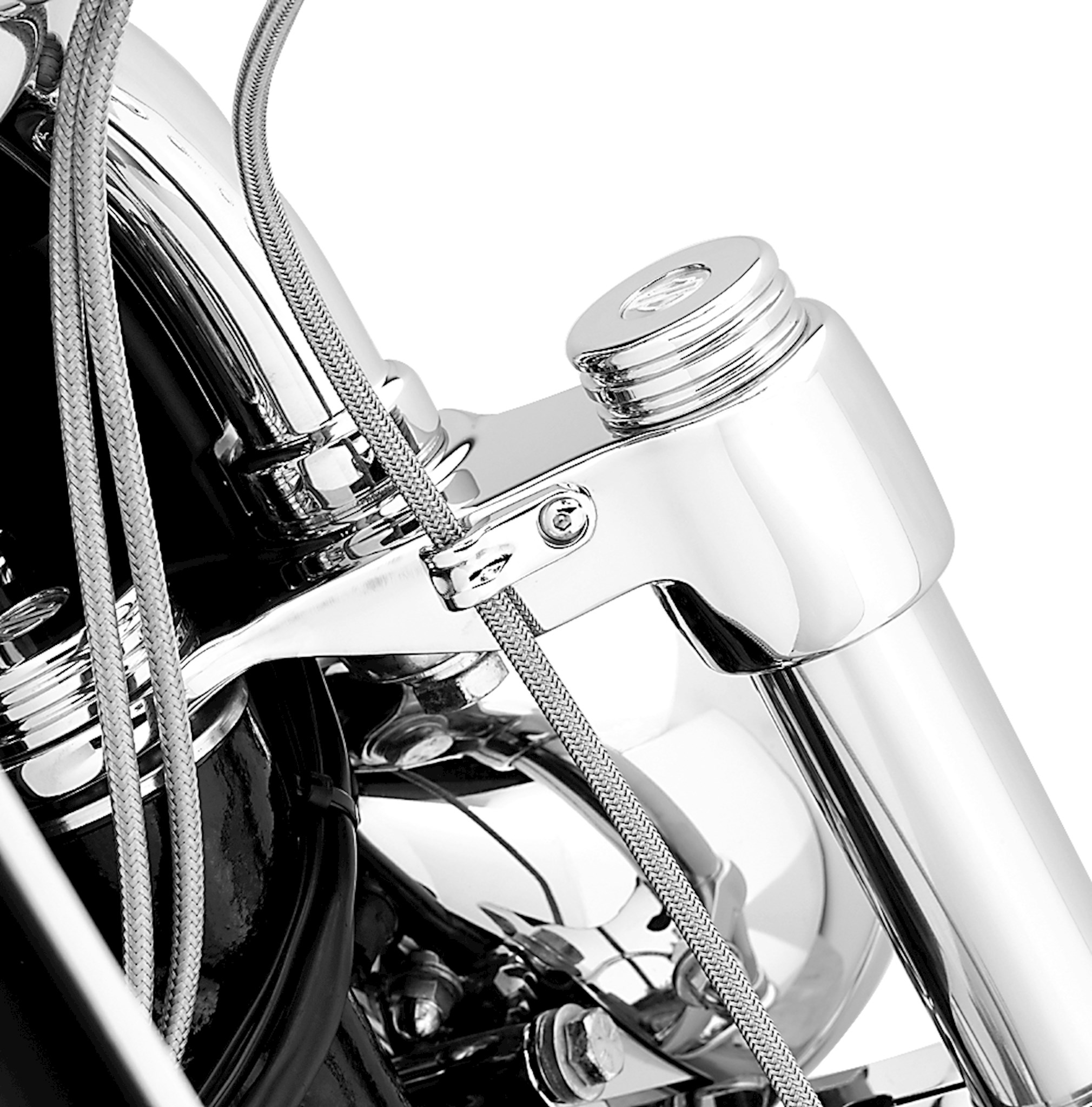 It's the details that count. Replace the Original Equipment black brake line clamp with this beautifully finished billet aluminum clip. These "ball-milled" clips mount in the factory position for easy installation. Kit includes chrome-plated mounting hardware. Fits '00-later FXST, FXSTB, FXSTC, FXSTD and FXDWG models equipped with braided brake lines. Also fits '08-later FXST, FXSTB, FXSTC and FXDWG with Original Equipment brake lines.