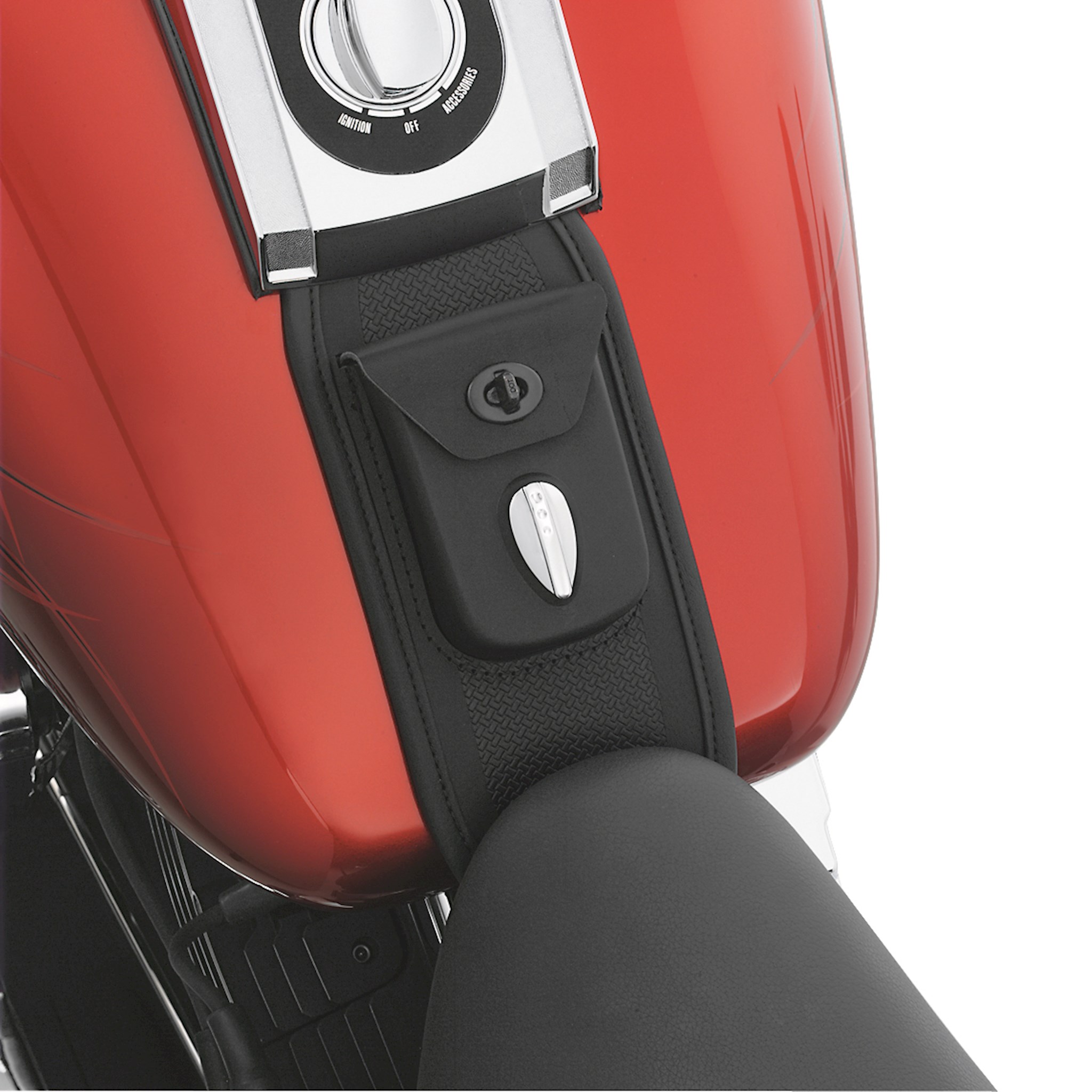 Stylish leather tank panel puts a convenient storage pouch right at your fingertips. Embossed basket-weave pattern and bright chrome teardrop concho matches the Softail Springerâ„¢ Classic trim and complements other smooth leather and vinyl seats and bags.