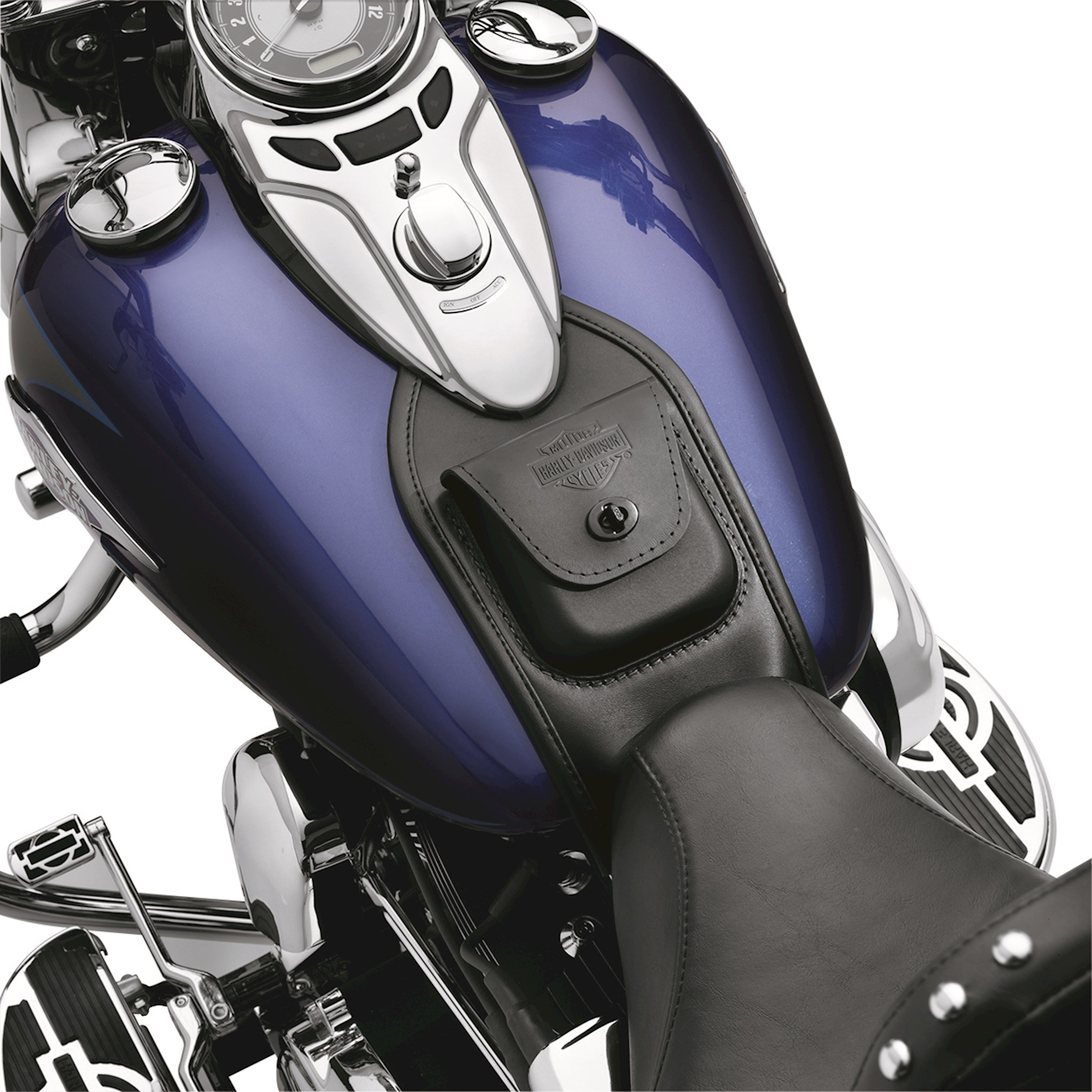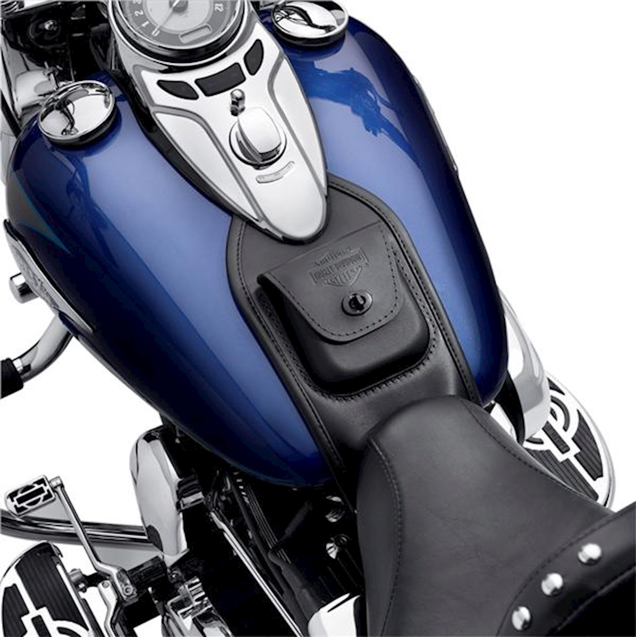 Trim your fuel tank with high-quality, durable genuine leather. The tank panel features a convenient leather-covered hard-shell storage pouch that retains its shape and a fingertip turn-buckle to secure the flap for easy access. The embossed Bar & Shield logo adds a classic finishing touch and is styled to complement Embossed Bar & Shield Logo Windshield Bag P/N 58308-95.