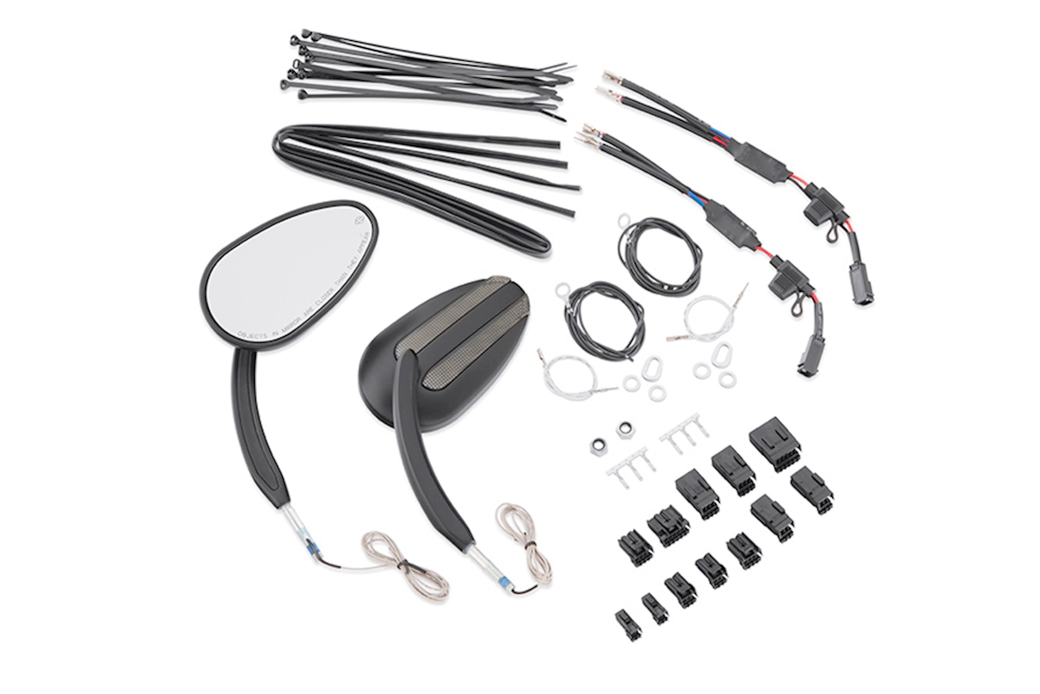 Function and style in one package. This forged mirror combines a traditional swept shape with a contemporary addition - forward-facing auxiliary lighting. Smoked lenses hide bands of amber LED lamps that glow as running lamps when the ignition is on and add a fast-acting auxiliary directional indicator when the turn signals are activated. The forward-facing eye-level lamps command additional attention from oncoming traffic. Both mirrors flash when the emergency hazard lights are activated. The wiring is concealed in the housing and stem and is easily connected to the Original Equipment wiring harness. Available in mirror-chrome or satin black finish. Fits '97-later models (except VRSCF, XG, XL1200X, FXCWC and '14-later Touring). Also fits '14-later Road King models.