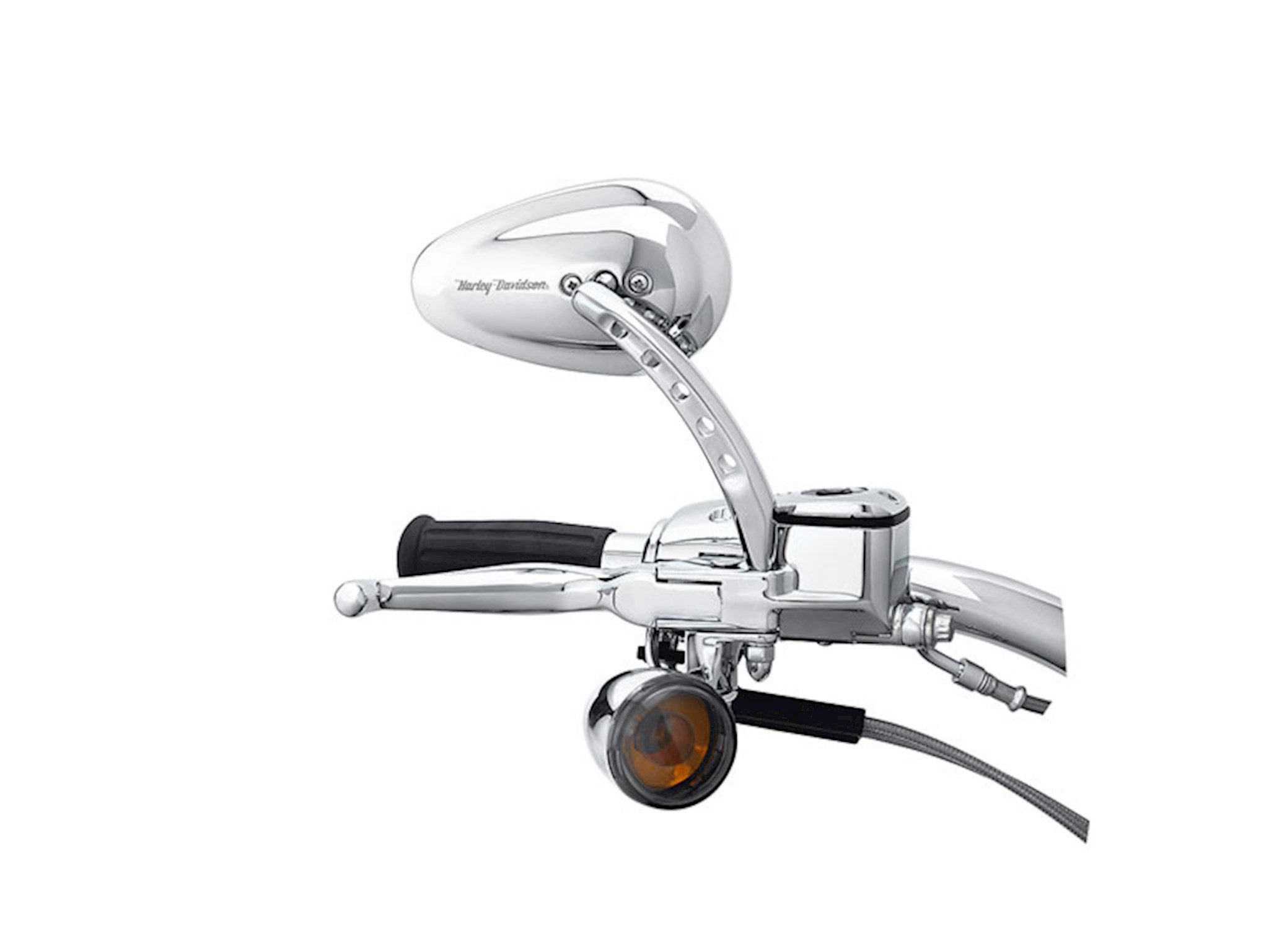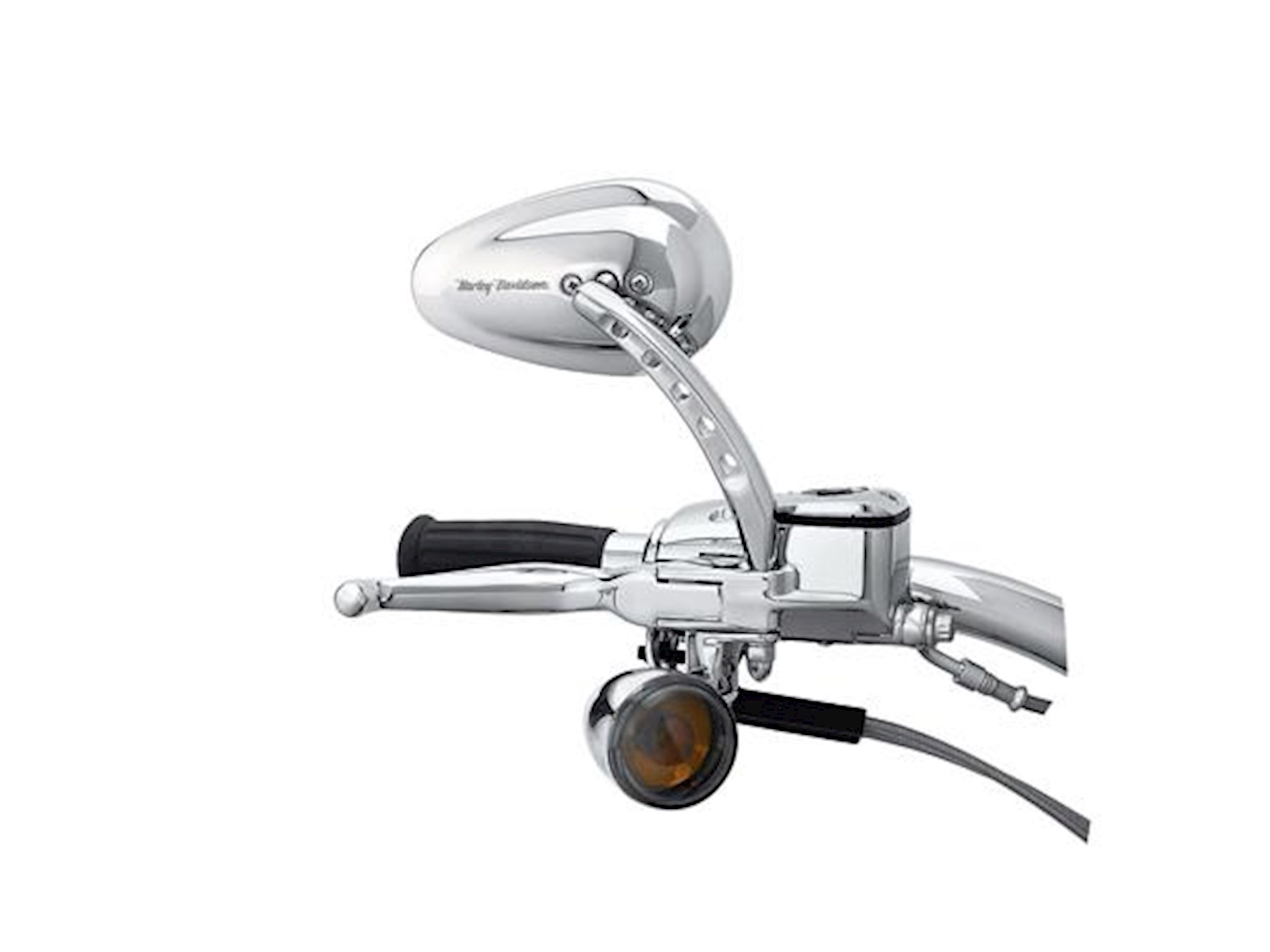 The deep grooved and perforated stem of this custom mirror is the ideal complement to the Buckshot Collection of foot and hand controls. The tapered mirror and stem are polished and chrome-plated or black-coated for a deep luster. Fits '82-later models (except VRSCF and XL1200X mounted below the handlebars).