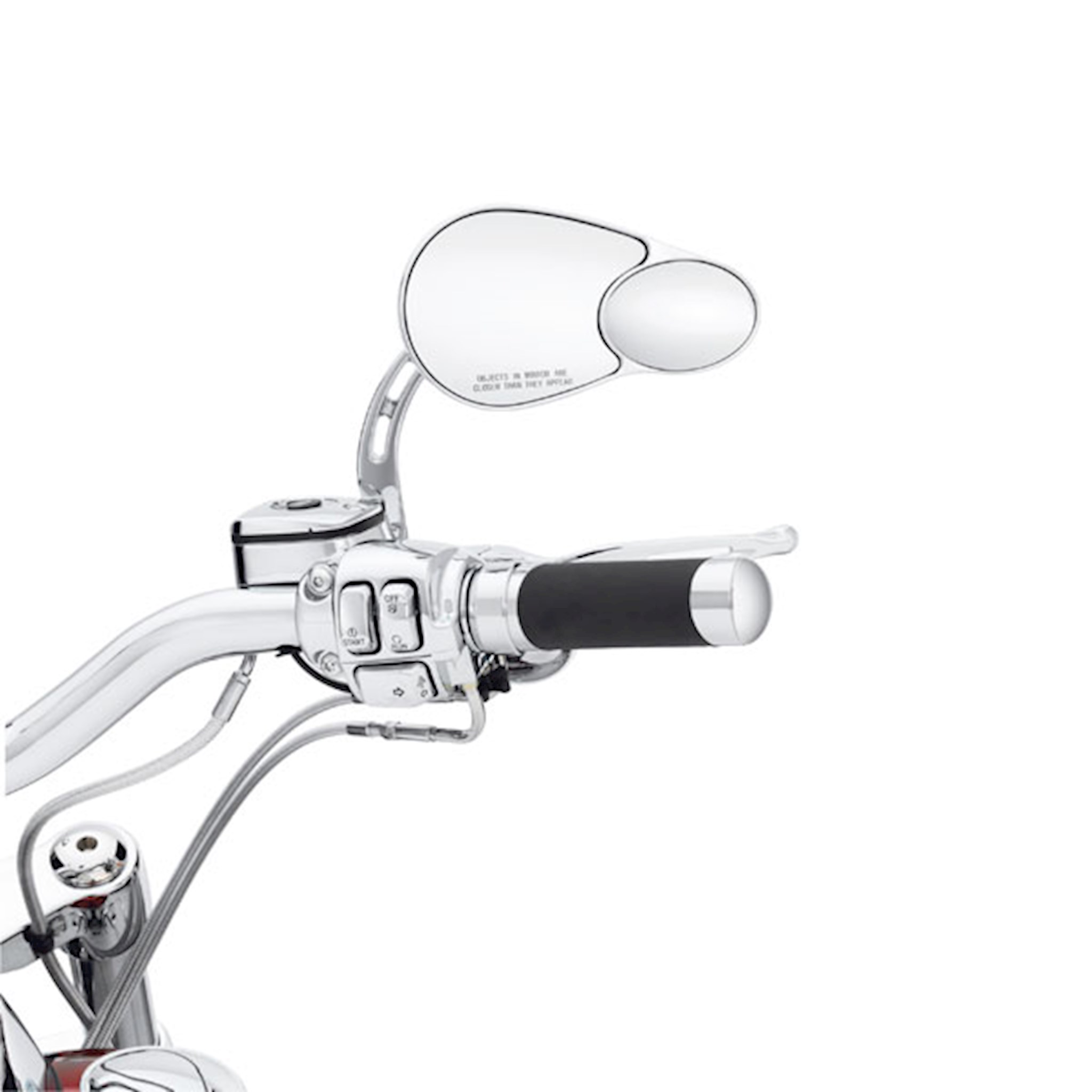 See even more of the world you just passed. This exclusive-design Split Vision Mirror minimizes blind spots and provides a wide panoramic rear view of the left and right lane and the road behind you. The mirror features a large primary panel for normal view and a second outboard convex panel for a wider field of vision. Chrome-plated to a brilliant shine, the mirror's shape adds a contemporary touch to the traditional teardrop design. The deep embossed "Harley-Davidson" script and the curving slotted stem set this mirror apart from the others.