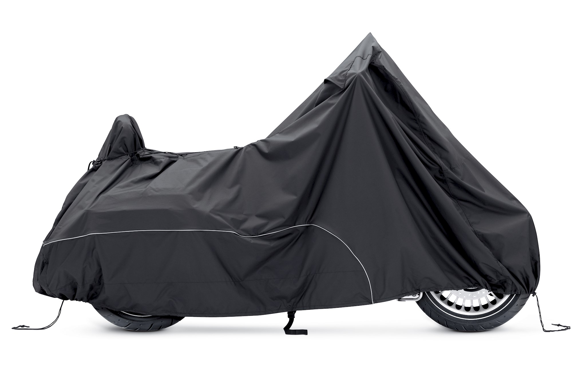 Guard your bike from Mother Nature. Perfect for a bike that is exposed to the elements, this heavy duty cover is manufactured from diamond-pattern 300 Denier fade-resistant polyester and features taped seams for water resistance. The weather-shielded vents in the top of the cover promote air circulation to reduce moisture build-up and minimize corrosion during short or long term storage. Internal heat-resistant panels protect the cover from warm exhaust and an integrated storage pouch permits convenient packing when not in use. The cover skirt features front and rear adjustable drawstrings to cinch the cover around the bike and a convenient belly strap to reduce ballooning in the wind. The corset-style cinching system along the backbone lets you adjust the cover for best fit on a variety of models and the hook-and-loop opening on Touring and Trike covers accommodate antennas. Cover features a convenient opening near the front wheel for a security chain or cable and internal pockets that accept the optional Cover Alarm (P/N 69000038). Available in your choice of two-tone orange and black or inconspicuous plain black finish, the covers features reflective piping for added visibility. Fits VRSC™, XG, XL, XR, Dyna® and Softail® models.