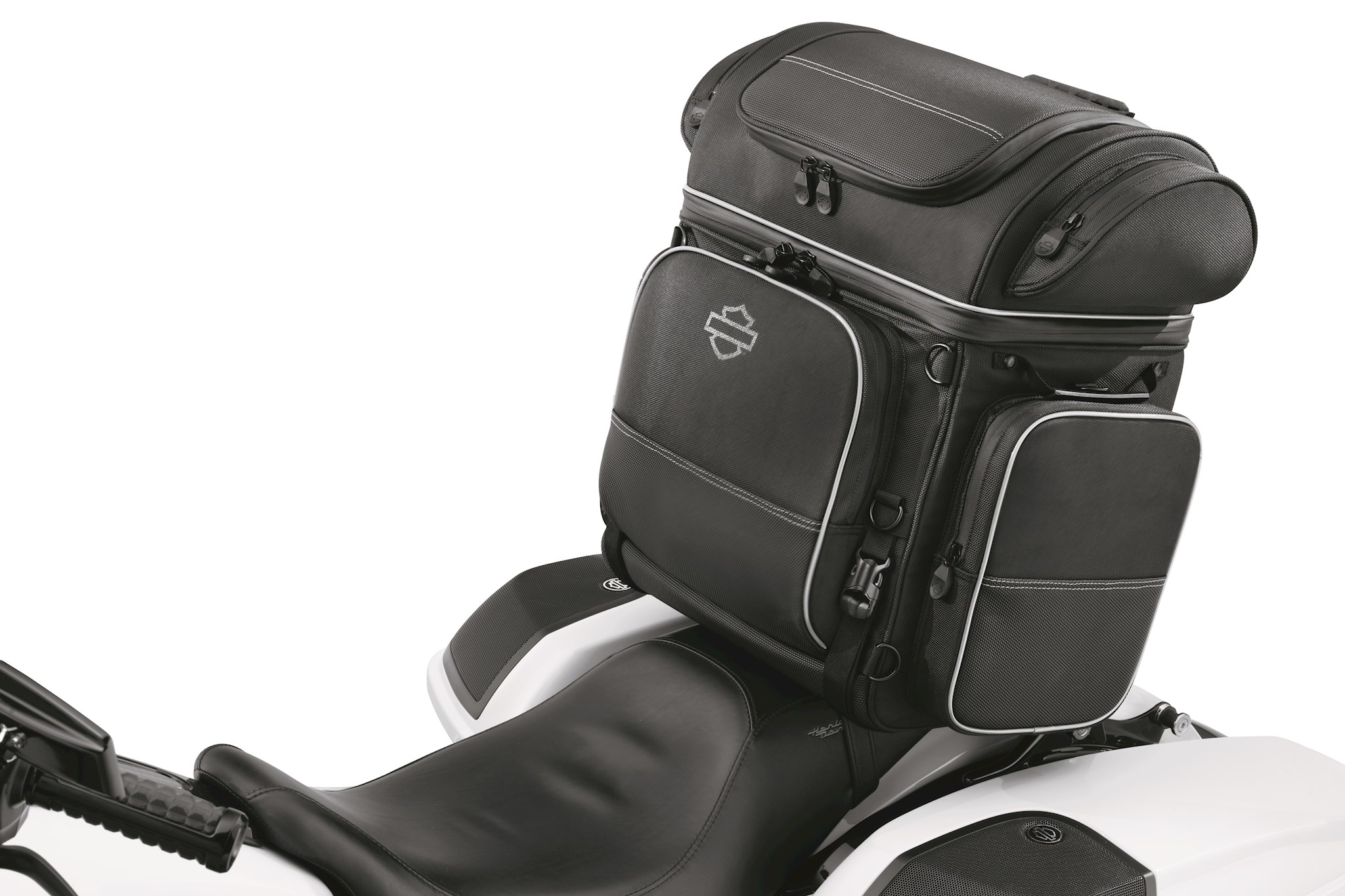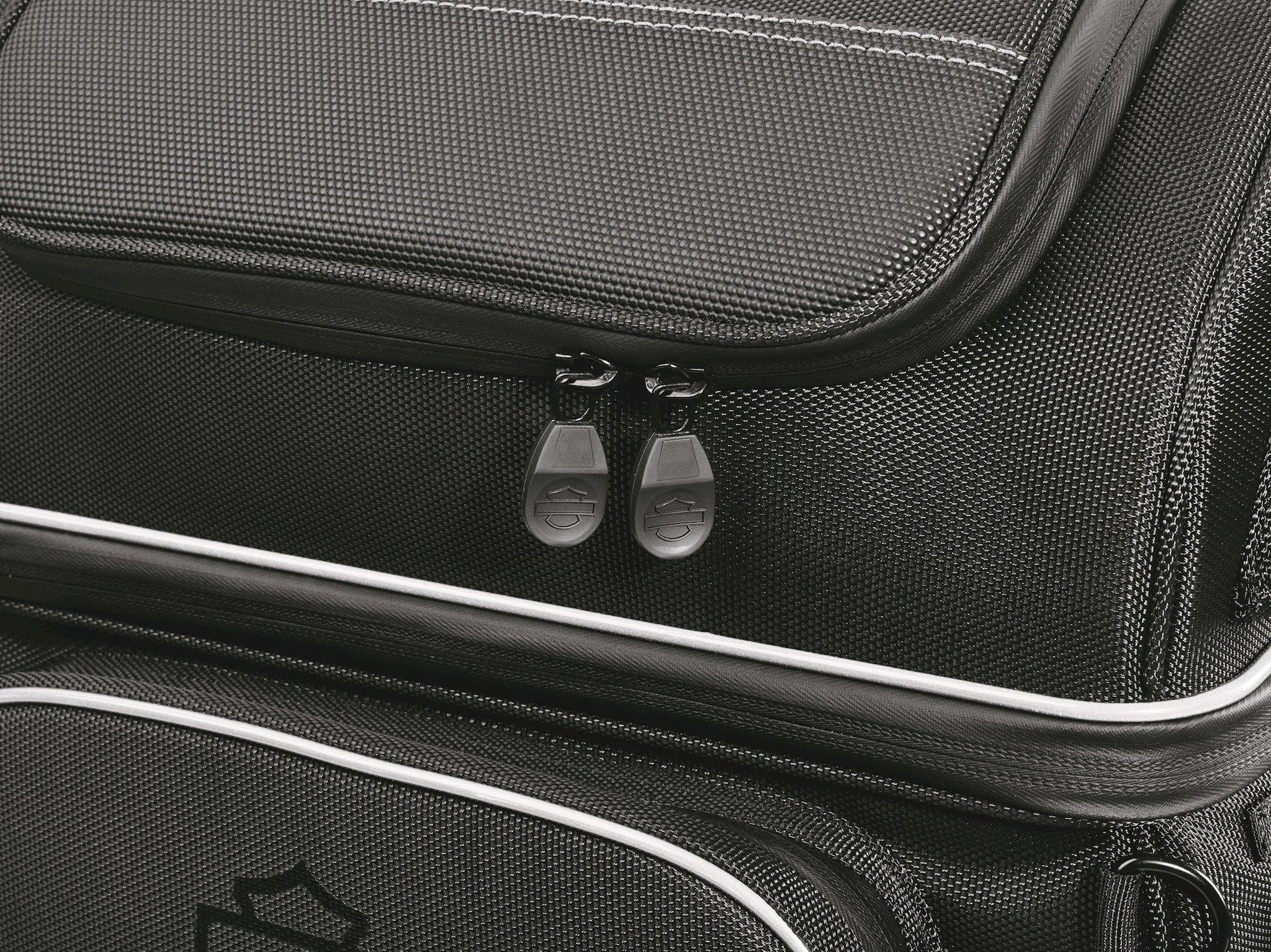 Designed by riders for riders the Onyx Premium Luggage Collection is the best luggage Harley-Davidson has to offer and, provides everything you need in motorcycle luggage and nothing you don't. Made of premium 1680 denier, UV-stable ballistic polyester material, these bags will stand up to the toughest road and weather conditions and won’t fade through years of use. All bags in the collection feature water-resistant zippers with rubber Harley-Davidson® branded, glove-friendly zipper pulls for easy open and close, a burnt orange interior that allows you to see the bag's contents in almost any light, a plethora of internal and external pockets to make organization easy, MOLLE-style webbing for easy modular pouch attachment and, reflective piping to provide visibility to other motorists. Abrasion-resistant non-slip material on the bottom of each bag ensures the bag stays put, and each bag includes a rain cover featuring an elastic hem and barrel lock mechanism so the cover can be cinched tight ensuring it stays in place at highway speeds. All Onyx Collection Premium Luggage features a limited two-year warranty. See Dealer for details. The Onyx Collection Touring Bag is perfect for long haul trips. This bag features a separate top compartment to keep your shoes separate from your clothes, a main compartment that can store enough jeans and t-shirts for a two week trip and the main compartment lid features removeable lid straps that keep the top compartment from falling forward or back when loading the main compartment. The large front pocket holds keys, pens, documents and small electronics. The two outer pockets at the top of the bag are perfect for eyewear storage, while the two large lower exterior pockets are perfect for storing rain gear.