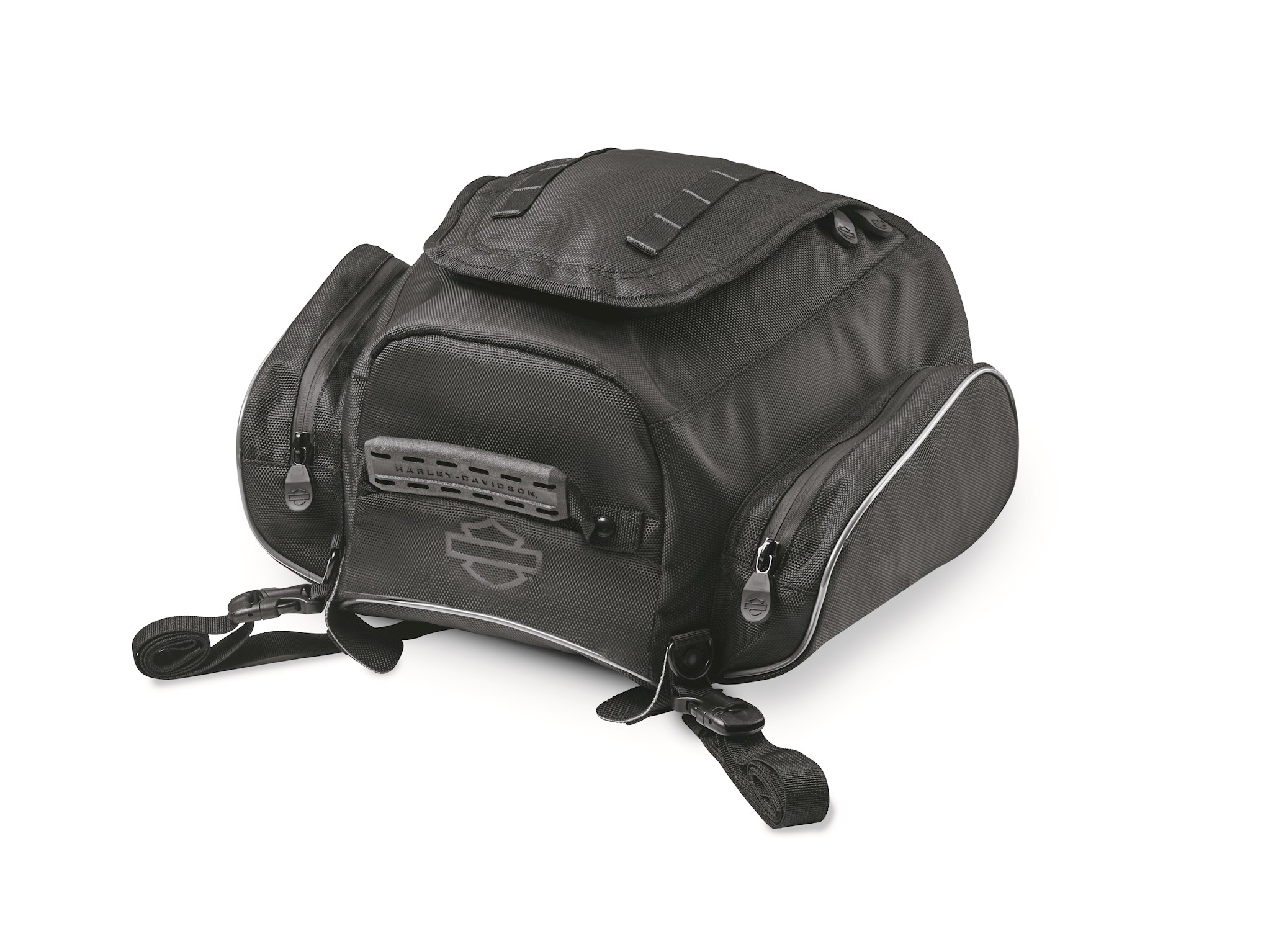 Designed by riders for riders the Onyx Premium Luggage Collection provides everything you need in motorcycle luggage and nothing you don't. Made of premium 1680 denier, UV-stable ballistic polyester material, these bags will stand up to the toughest road and weather conditions and won’t fade through years of use. All bags in the collection feature water-resistant zippers with rubber Harley-Davidson® branded, glove-friendly zipper pulls for easy open and close, a burnt orange interior that allows you to see the bag's contents in almost any light, a plethora of internal and external pockets to make organization easy, MOLLE-style webbing for easy modular pouch attachment and, reflective piping to provide visibility to other motorists. Abrasion-resistant non-slip material on the bottom of each bag ensures the bag stays put, and each bag includes a rain cover featuring an elastic hem and barrel lock mechanism so the cover can be cinched tight ensuring it stays in place at highway speeds. All Onyx Collection Premium Luggage features a limited two-year warranty. See Dealer for details. Great for daily commutes or for extra storage any time, this Tail Bag provides the space you need. The main compartment is large enough to store a half helmet, rain gear or extra layers, while zipped side pockets are large enough to hold gloves or small electronic devices. The Tail Bag mounts to a passenger pillion and has locking, quick-release clasps for easy on and off the bike. The sturdy top hand and detachable shoulder strap make it easy to carry the bag to and from your motorcycle.