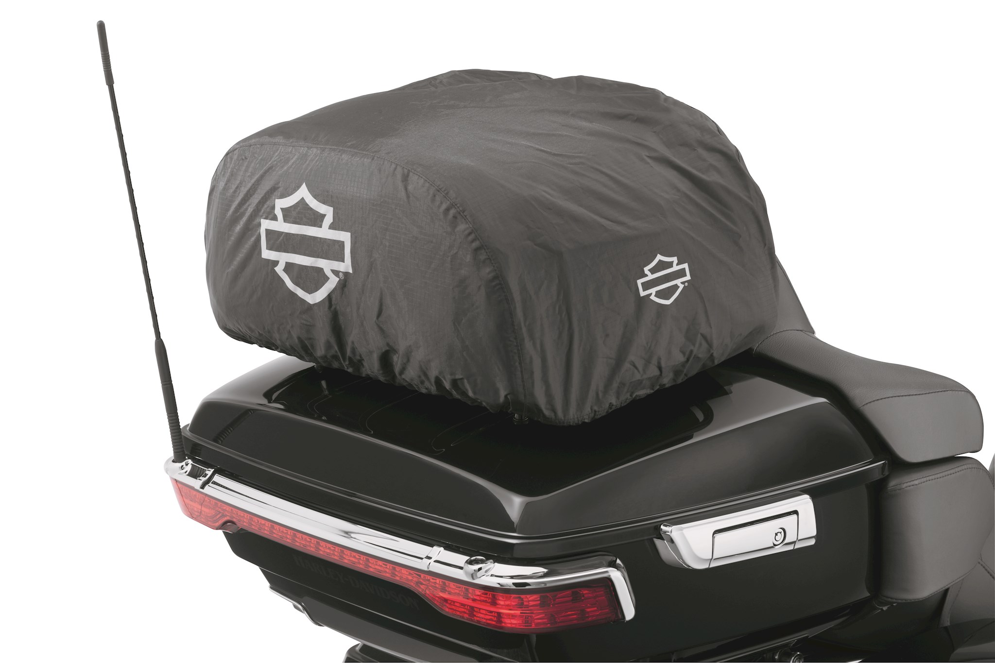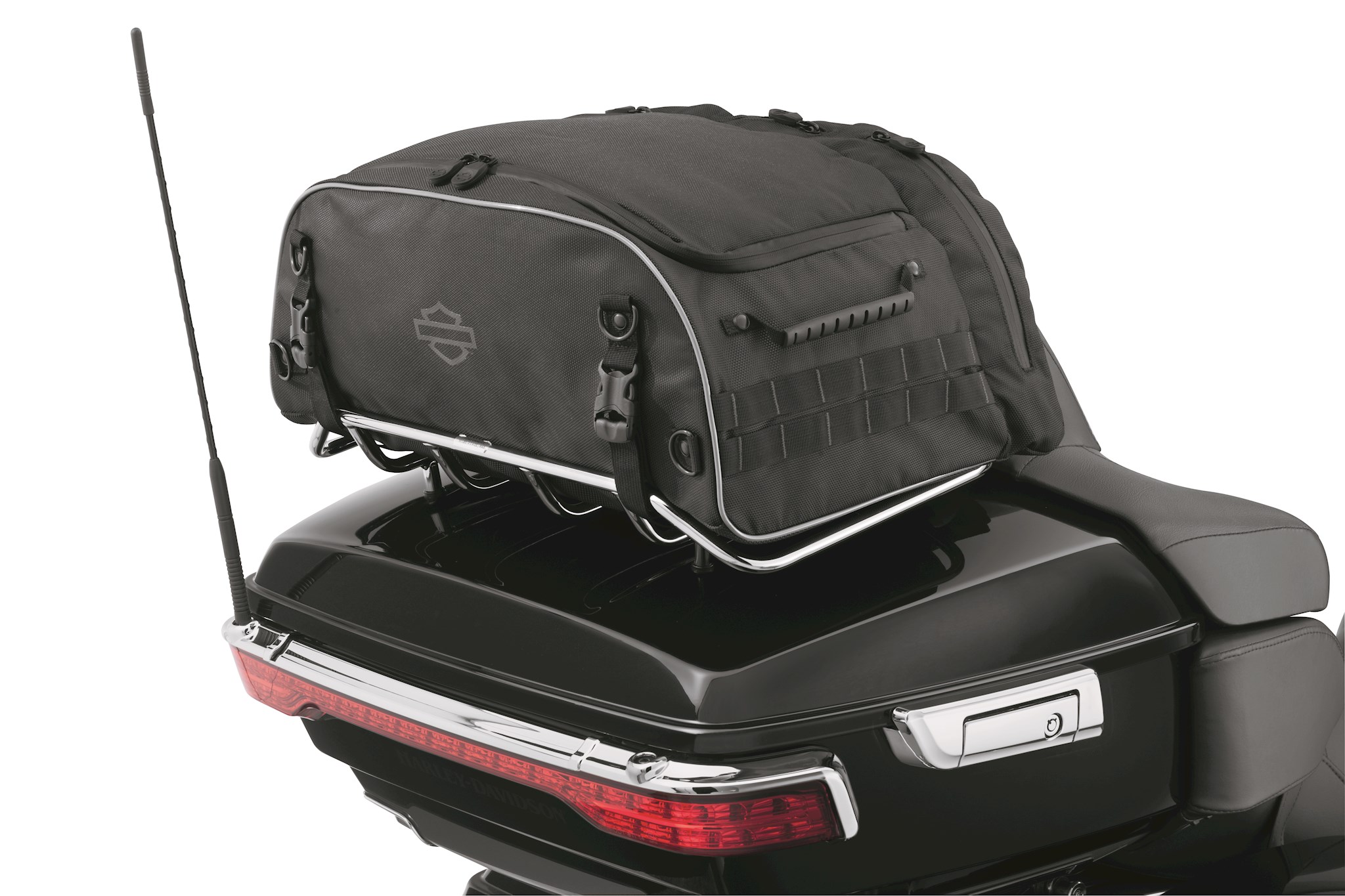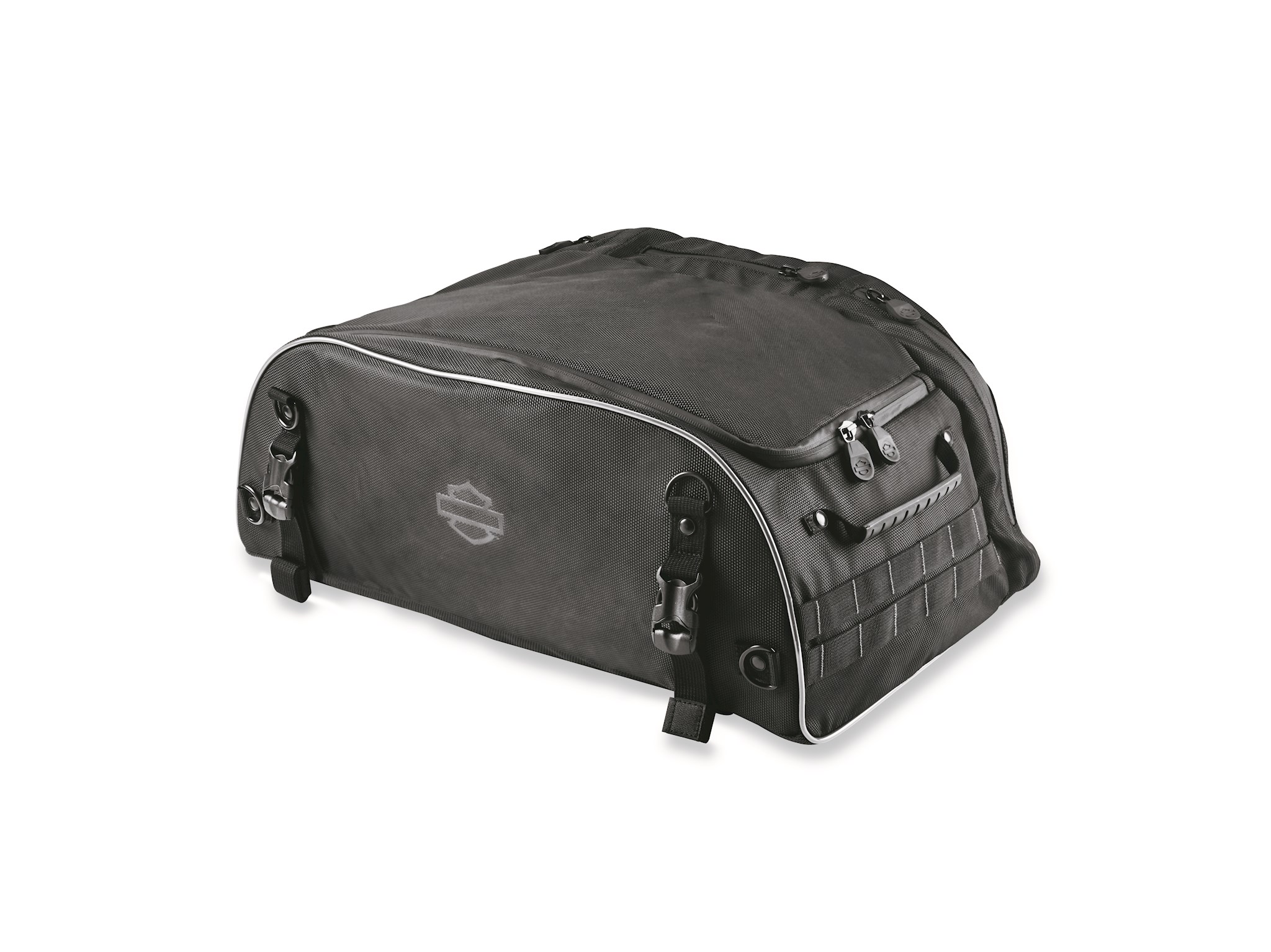 Designed by riders for riders the Onyx Premium Luggage Collection provides everything you need in motorcycle luggage and nothing you don't. Made of premium 1680 denier, UV-stable ballistic polyester material, these bags will stand up to the toughest road and weather conditions and won’t fade through years of use. All bags in the collection feature water-resistant zippers with rubber Harley-Davidson® branded, glove-friendly zipper pulls for easy open and close, a burnt orange interior that allows you to see the bag's contents in almost any light, a plethora of internal and external pockets to make organization easy, MOLLE-style webbing for easy modular pouch attachment and, reflective piping to provide visibility to other motorists. Abrasion-resistant non-slip material on the bottom of each bag ensures the bag stays put, and each bag includes a rain cover featuring an elastic hem and barrel lock mechanism so the cover can be cinched tight ensuring it stays in place at highway speeds. All Onyx Collection Premium Luggage features a limited two-year warranty. See Dealer for details. This Collapsible Rack Bag is similar to our other premium Tour-Pak Rack Bags, with the added benefit that it can be folded down to a fraction of its expanded size and placed in a saddlebag when not in use. Take it with you on your trip and bring home all the T-shirts and extra things you may buy at a rally or on a long trip. The Collapsible Tour-Pak Rack Bag comes with a removeable shoulder strap for easy transport from the bike to your hotel.