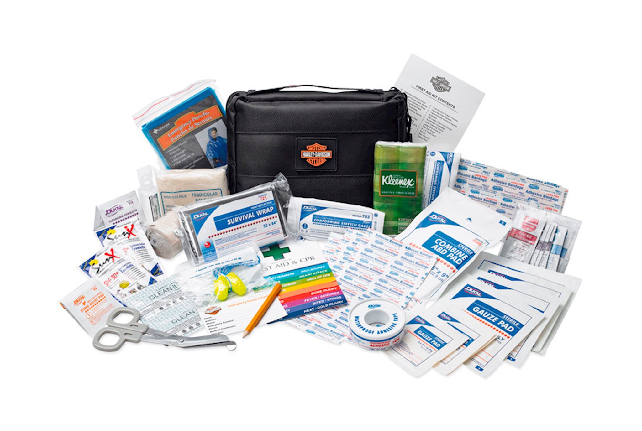 A first aid kit designed for the HOG® Road Captain or a serious long-distance rider. Housed in a convenient 8.0" x 6.0" x 3.0" zippered nylon case, this kit includes: sunscreen packets, burn cream packets, hand sanitizer packets, antibiotic packets, eyewash, gauze pads, plastic and flexi strips and bandages, gauze, waterproof tape, latex-free gloves, cleansing towelettes, insect sting pads, lens cleaning cloth, ear plugs, tissues, scissors, survival wrap, rain poncho, paper, pencil, and an English-language quick first aid guide. Intended for U.S. market.