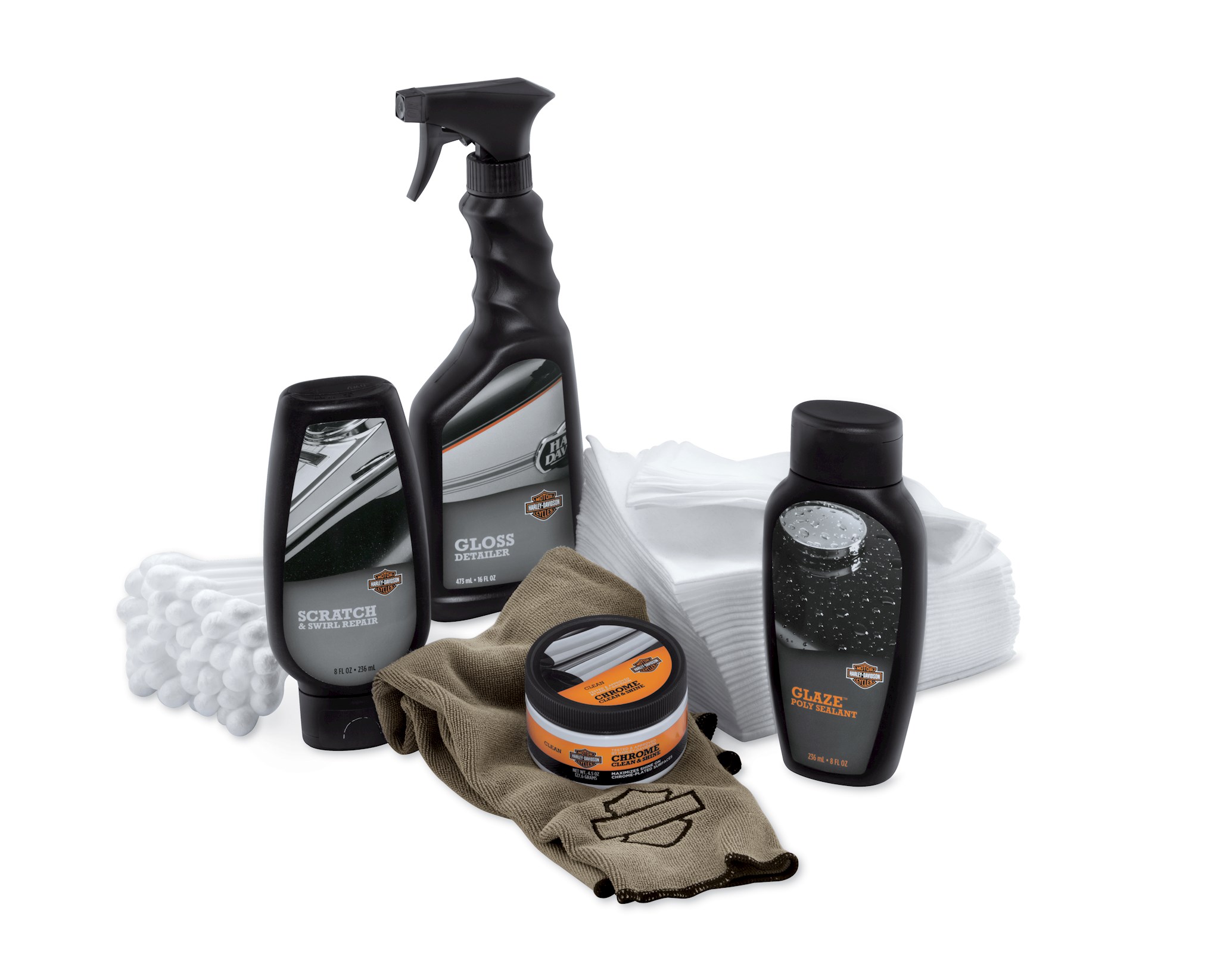 Detail & Protect Kit includes the essentials to make your bike shine.• Glaze™ Poly Sealant protects against fading and the oxidizing effects of acid rain and harsh airborne pollutants. The durable, breathable, clear poly sealant with UV protection is safe for use on most painted and chrome-plated surfaces. (Not for use on matte, semi-gloss and wrinkle finish surfaces.) Biodegradable.• Gloss Detailer spray delivers a high-gloss finish in the shortest amount of time. Use on paint, chrome, vinyl, plastic and windshields for added UV protection. Biodegradable.• Chrome Clean & Shine non-abrasive cleaner is formulated to deliver maximum shine on chrome-plated surfaces. • Scratch & Swirl Repair cream removes fine scratches and swirls from gloss paint in one step.• Disposable Detailing Soft Cloths protect painted surfaces and minimize lint while waxing and polishing.• Microfiber Detailing Cloth is soft and durable for detailing, cleaning or buffing. The washable cloth can be used wet or dry and is safe for use on all surfaces and finishes.• Detailing Swabs feature plush tips and flexible 8" shafts for detailing hard-to-reach places.