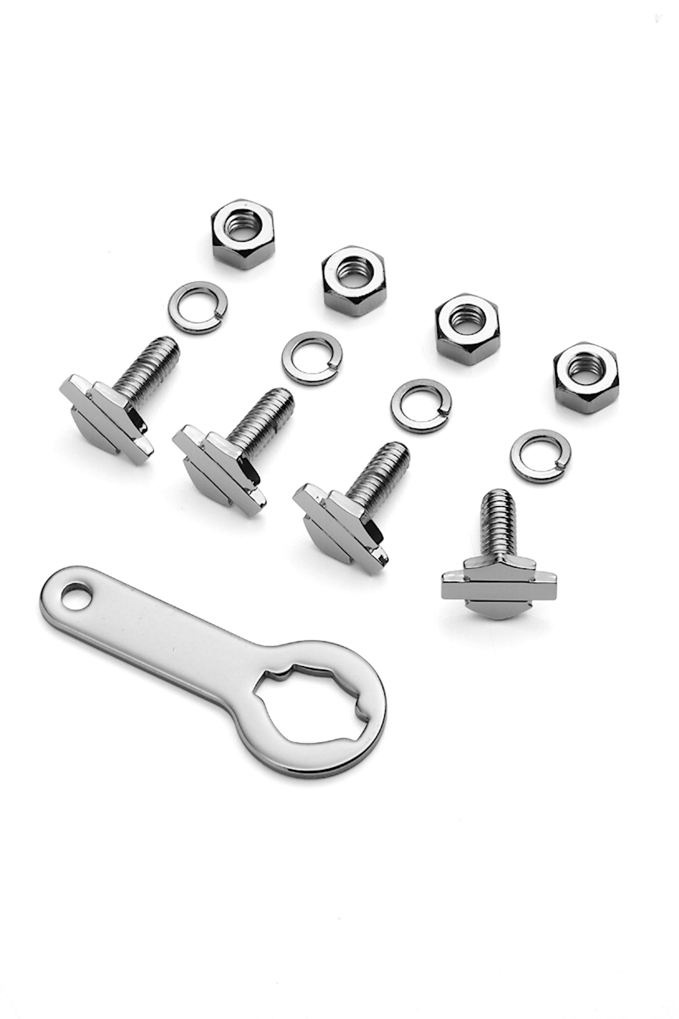 Proudly display the Bar & Shield. The Bar & Shield logo shaped bolt heads on this unique chrome-plated stainless steel License Plate Mounting Kit stand out from the pack. The hardware is installed with a custom Bar & Shield logo shaped wrench, reducing the possibility of license plate theft. The kit includes 4 lock nuts, washers, bolts and the special wrench.