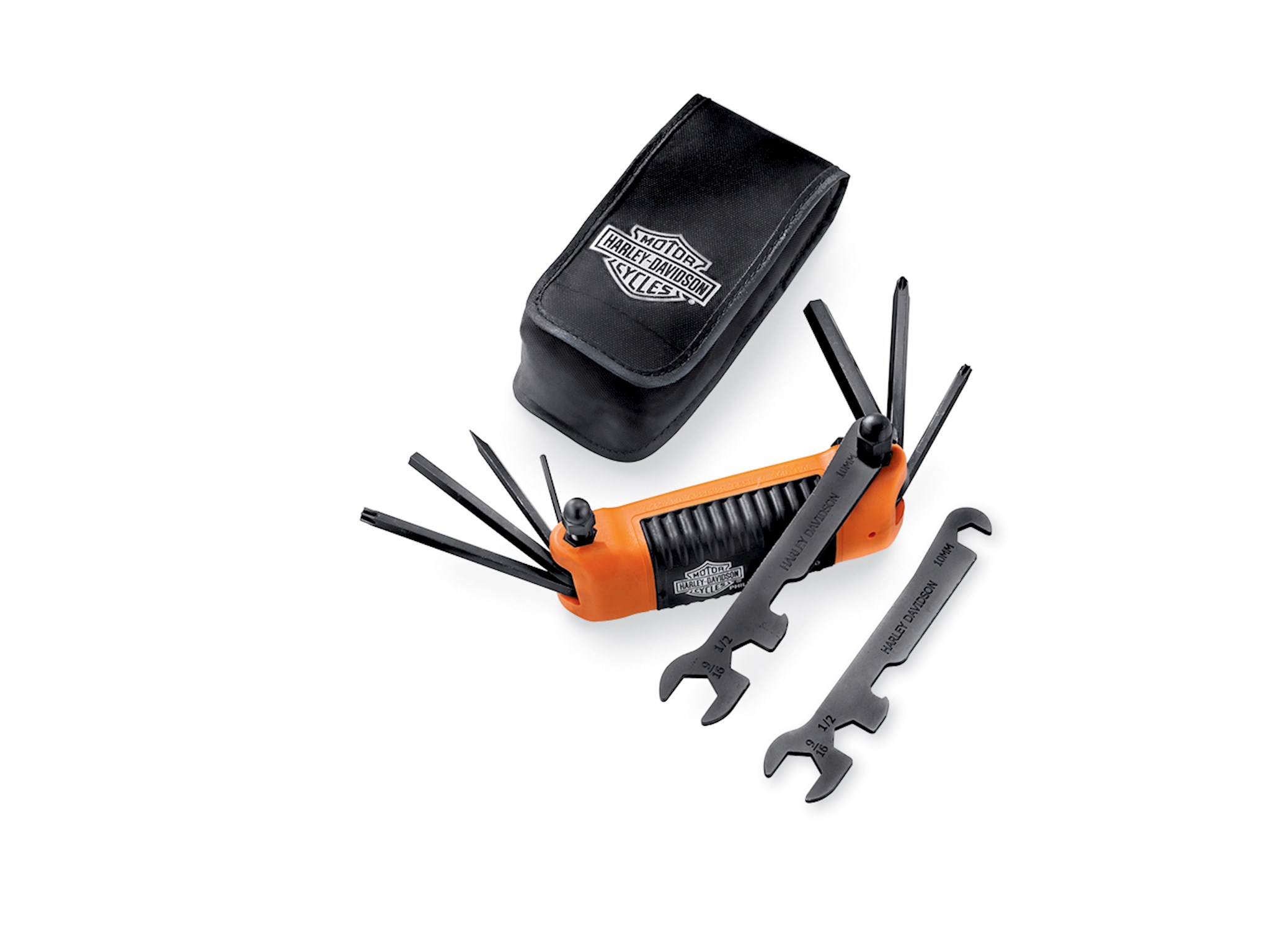This kit is the ideal traveling companion. Standard on the Ultra Classic® and Limited Electra Glide® model, this compact folding tool is equipped to perform the basic "on-the-road" service functions on most late-model Harley-Davidson® motorcycles. Large comfortable handle with a soft grip adds leverage, and holds the foldaway tools. Tool selection: Torx® bits - T27, T40; Hex Bits - 3/32", 1/4", 3/8"; Screwdriver Bits - Phillips, slotted; Open end wrenches (2) - 9/16", 1/2", 10mm. Kit includes nylon pouch with hook-and-loop closure and Bar & Shield logo.