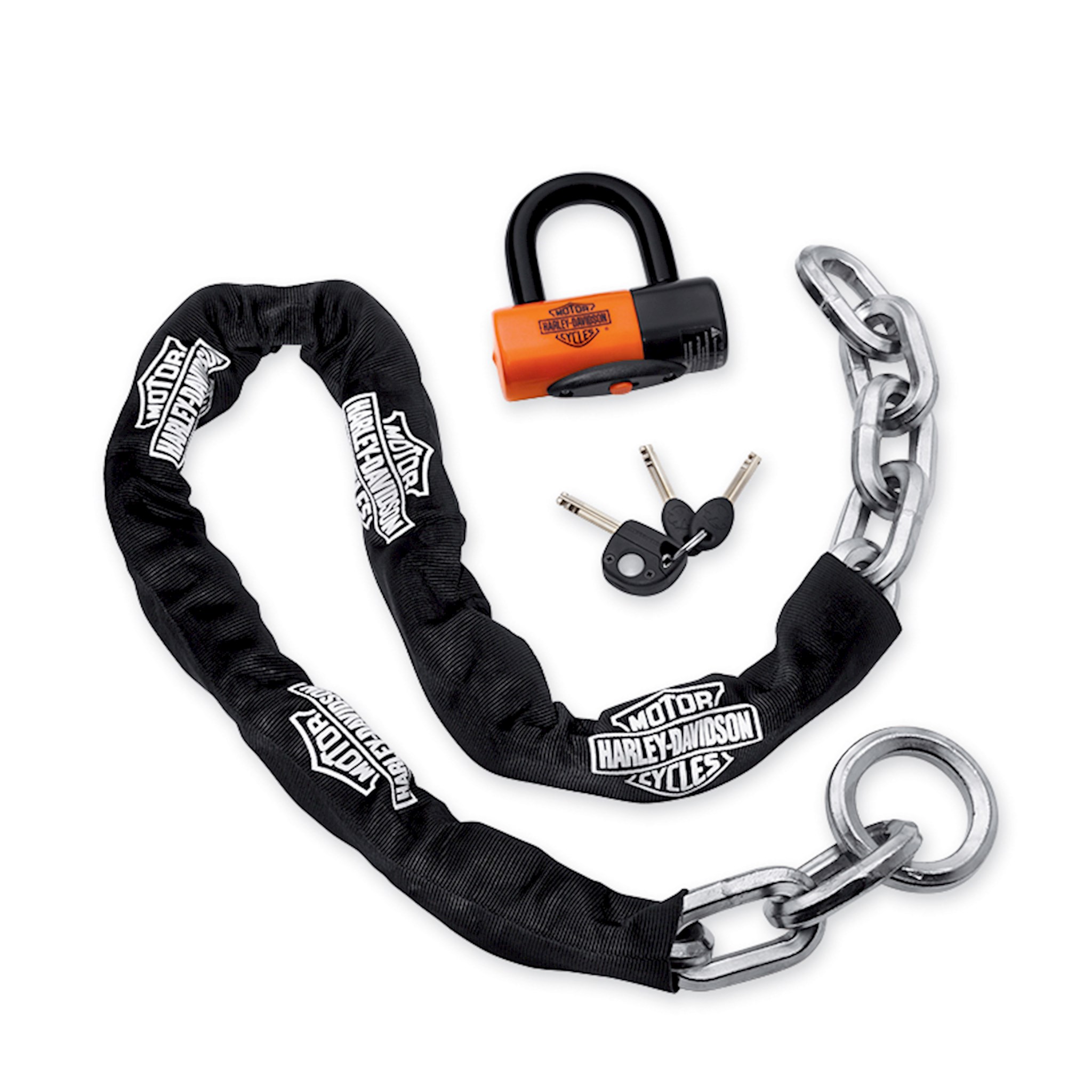 Maximum protection for your motorcycle. This high-security Noose Chain and Lock features a 12mm triple heat treated boron manganese 6-sided link steel chain with cinch ring for securing your bike to stationary objects. Put the chain around a post, slip the chain through the ring, and cinch it tight. Then loop the nylon-web covered chain through the frame or wheels of the bike and lock it up tight. The lock features a fully removable 14mm shackle, a double deadbolt design for added security, a high-security lock cylinder with anti-float discs and nylon molded dust cover, and a lighted key for nighttime locking. The orange color gives the lock greater visibility for added theft deterrence. Security chain length: 4.25'.