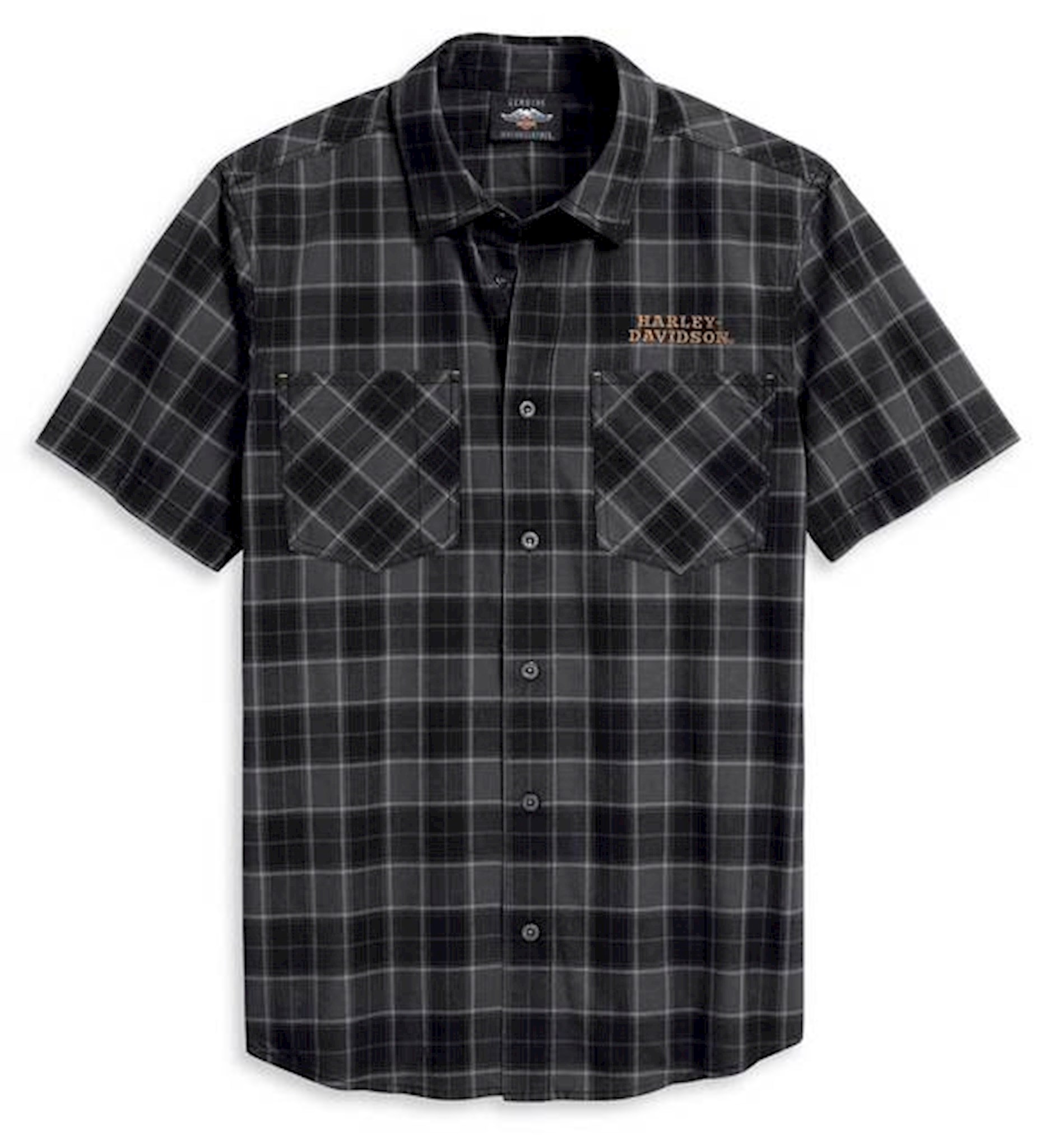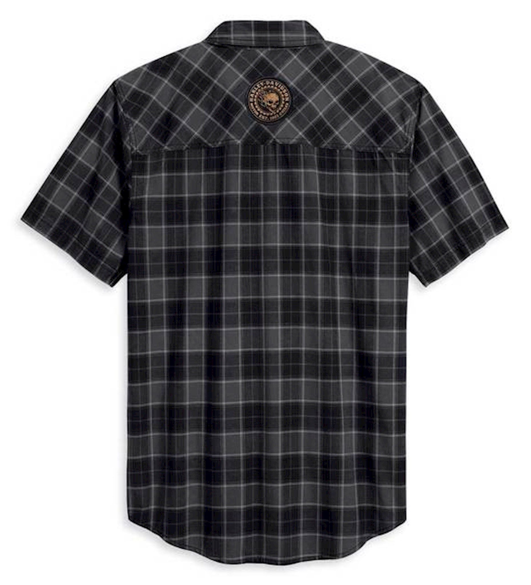 Harley-Davidson® Men's Flaming Skull Patch Plaid Shirt - Plaid, 96019-20VM. Want style without making a scene? Go with the dark, moody plaid on the Flaming Skull Patch Plaid Shirt. Soft, lightweight cotton poplin is washed for all-day softness. Embroidered graphics and an awesome skull patch add a punch of color to this men's short sleeve shirt. Made of 100% cotton poplin yarn-dyed plaid is washed for softness. Features: Snap-down collar, button front, and chest pockets with tire-gauge. Embroidered graphics, with printed patch.