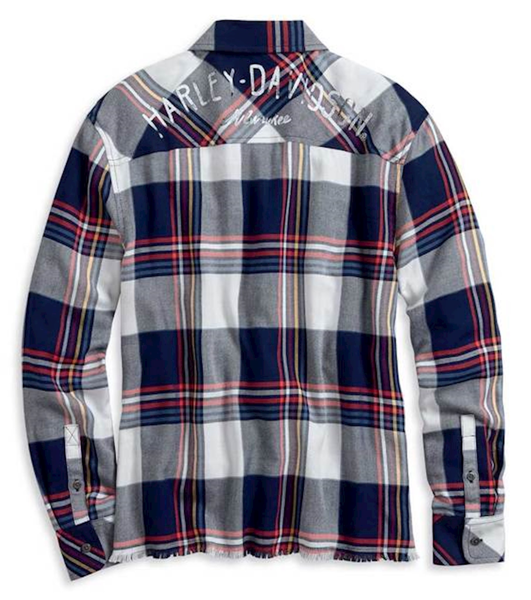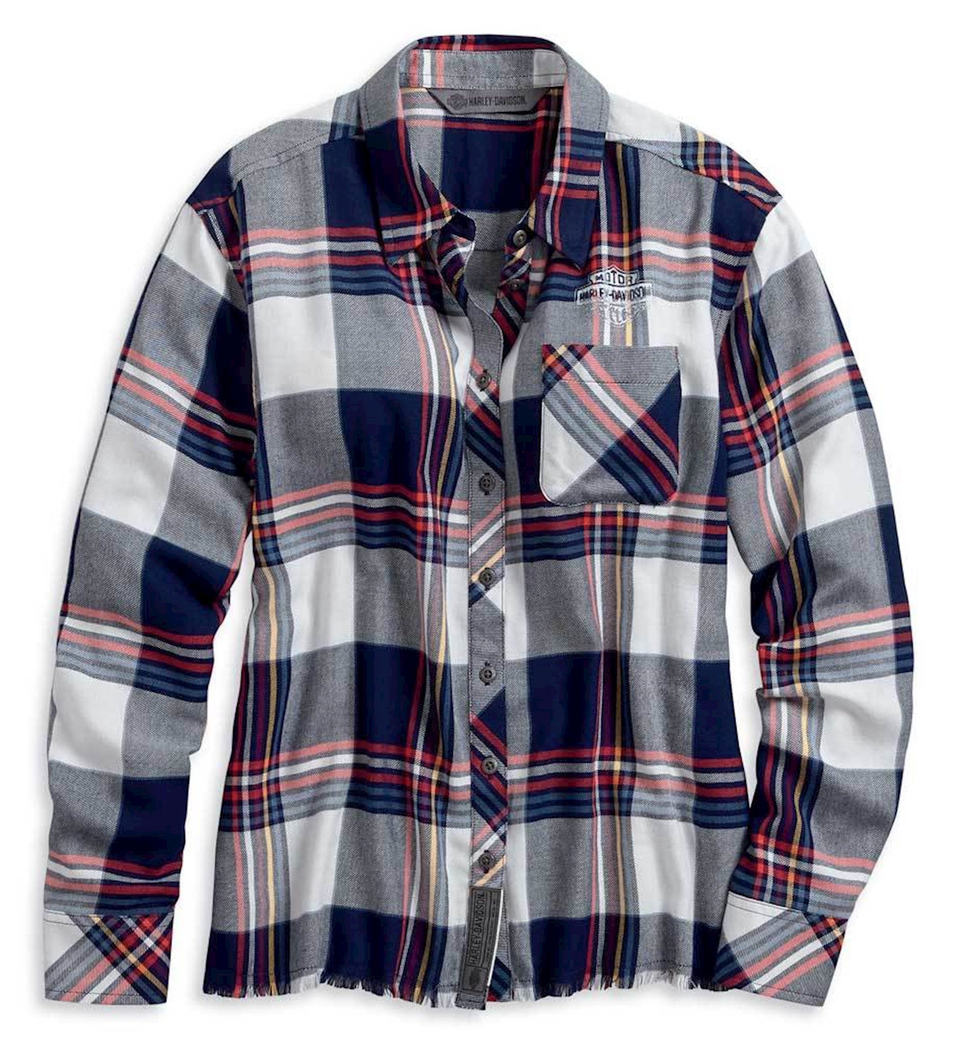 Harley-Davidson® Women's Raw Hem Plaid Shirt, 96059-20VW. Made from 100% rayon twill yarn-dyed plaid that is washed for softness. Snap-down collar. Button front and cuffs. Chest pocket. Raw-edge cutoff hem. Distressed printed graphics. Woven label.