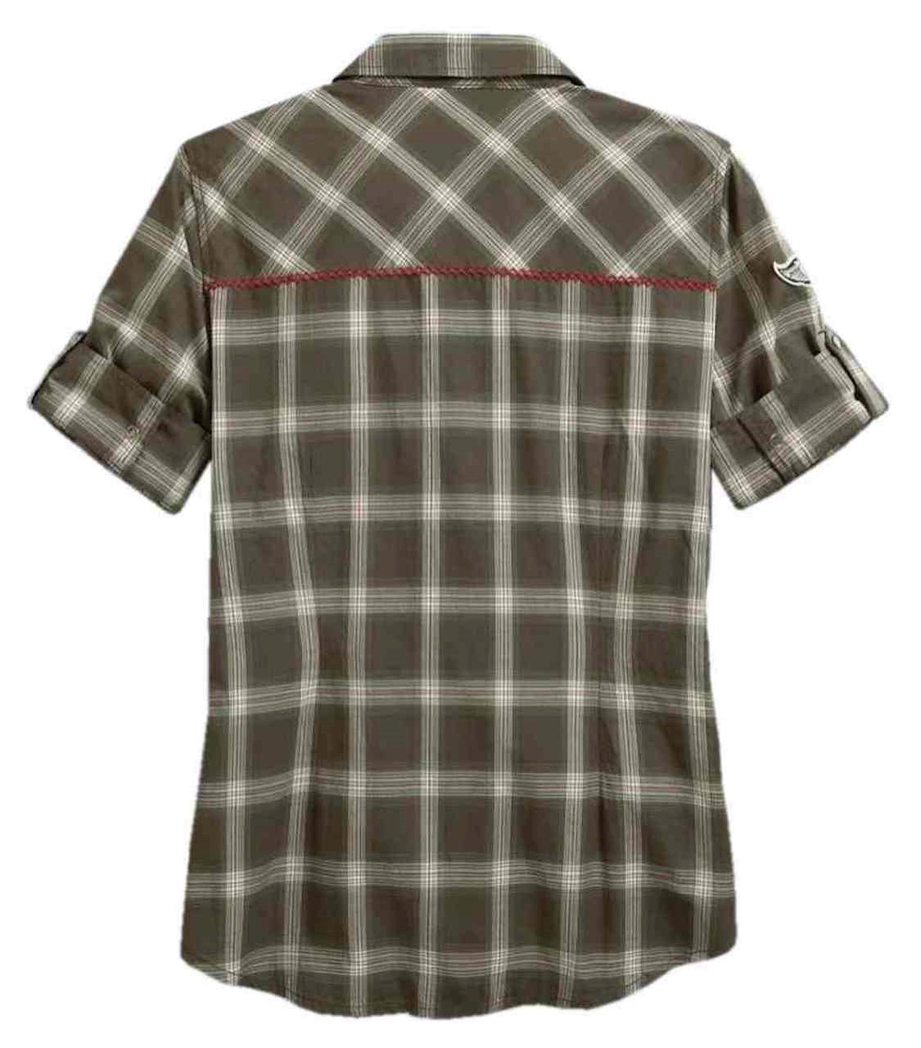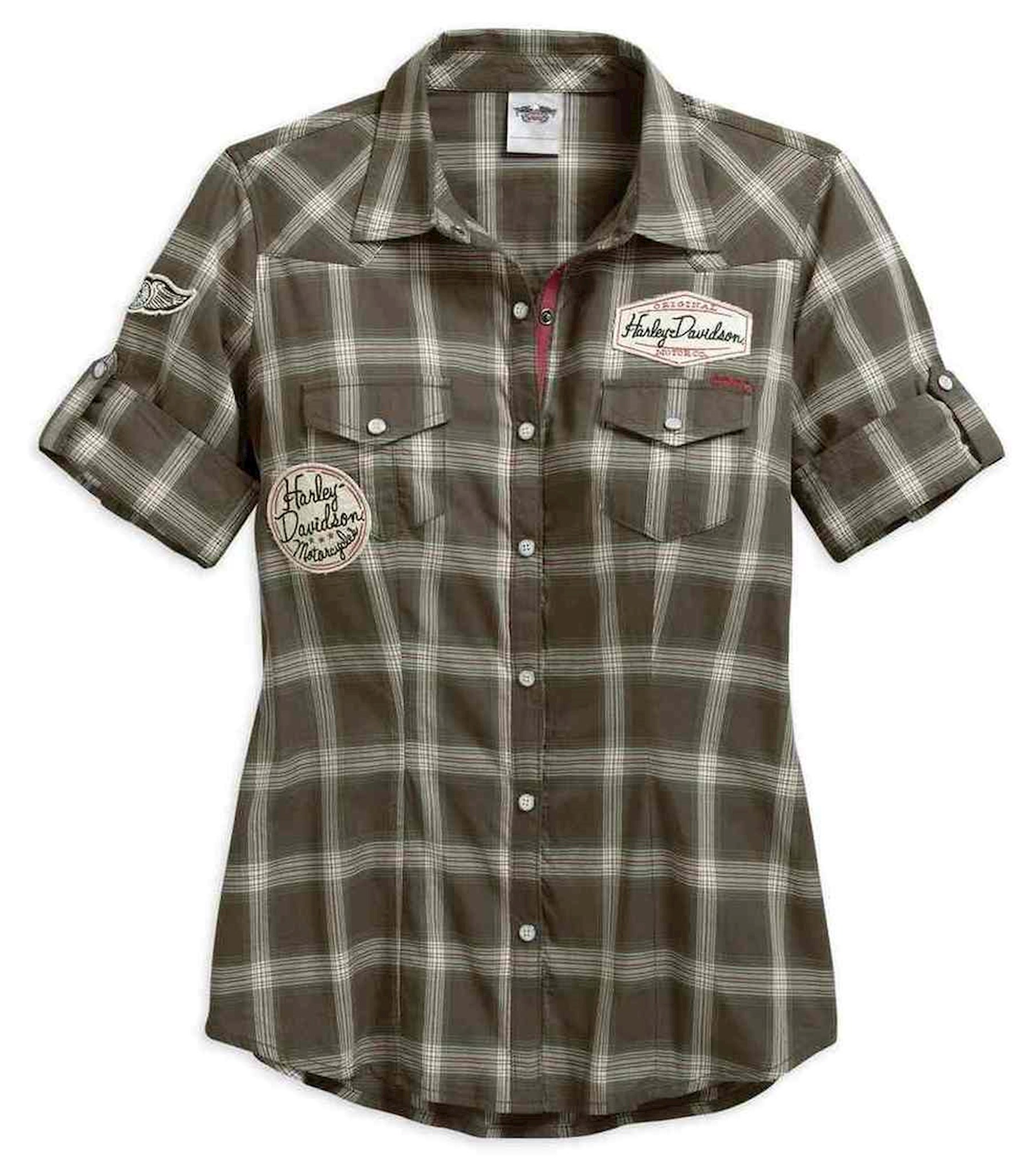 Harley-Davidson® Women's Multi-Patch Plaid Short Sleeve Shirt, 96077-17VW. Made of 100% cotton. Pearlized snap front. Two snap flap chest pockets with pearlized snaps. Rolled cuffs with snap tabs. Contrasting twill tape on snap placket. Contrasting chunky stitching on pocket and back yoke. Raw-edge embroidered patches on front.