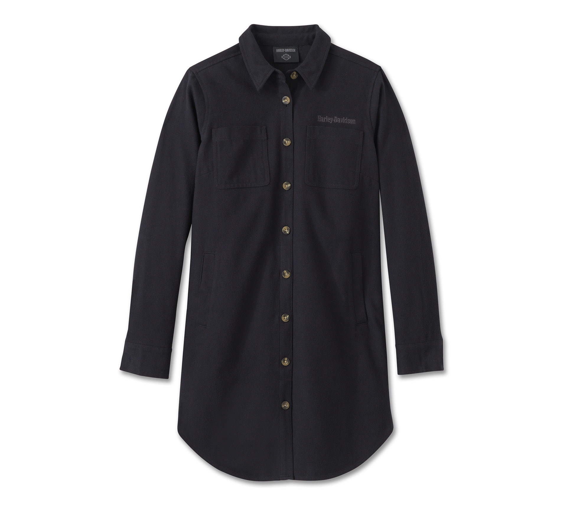 100% cotton heavyweight twill. Button front and cuffs. Hidden snaps on sleeve placket. HPS length: 37''.