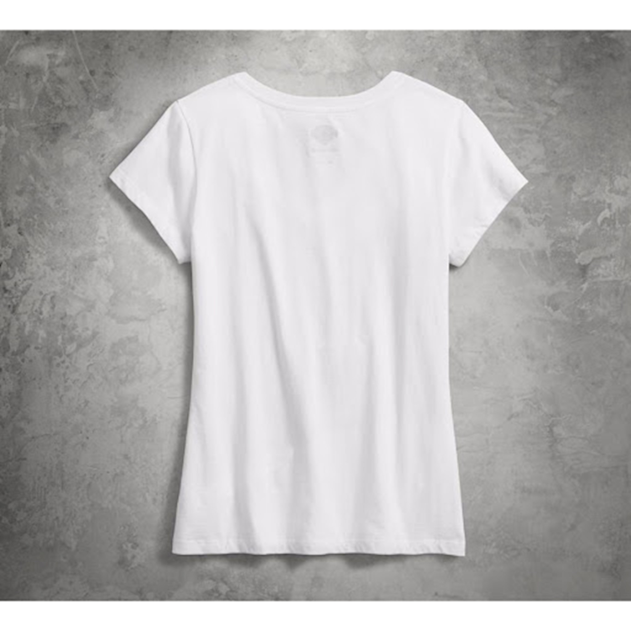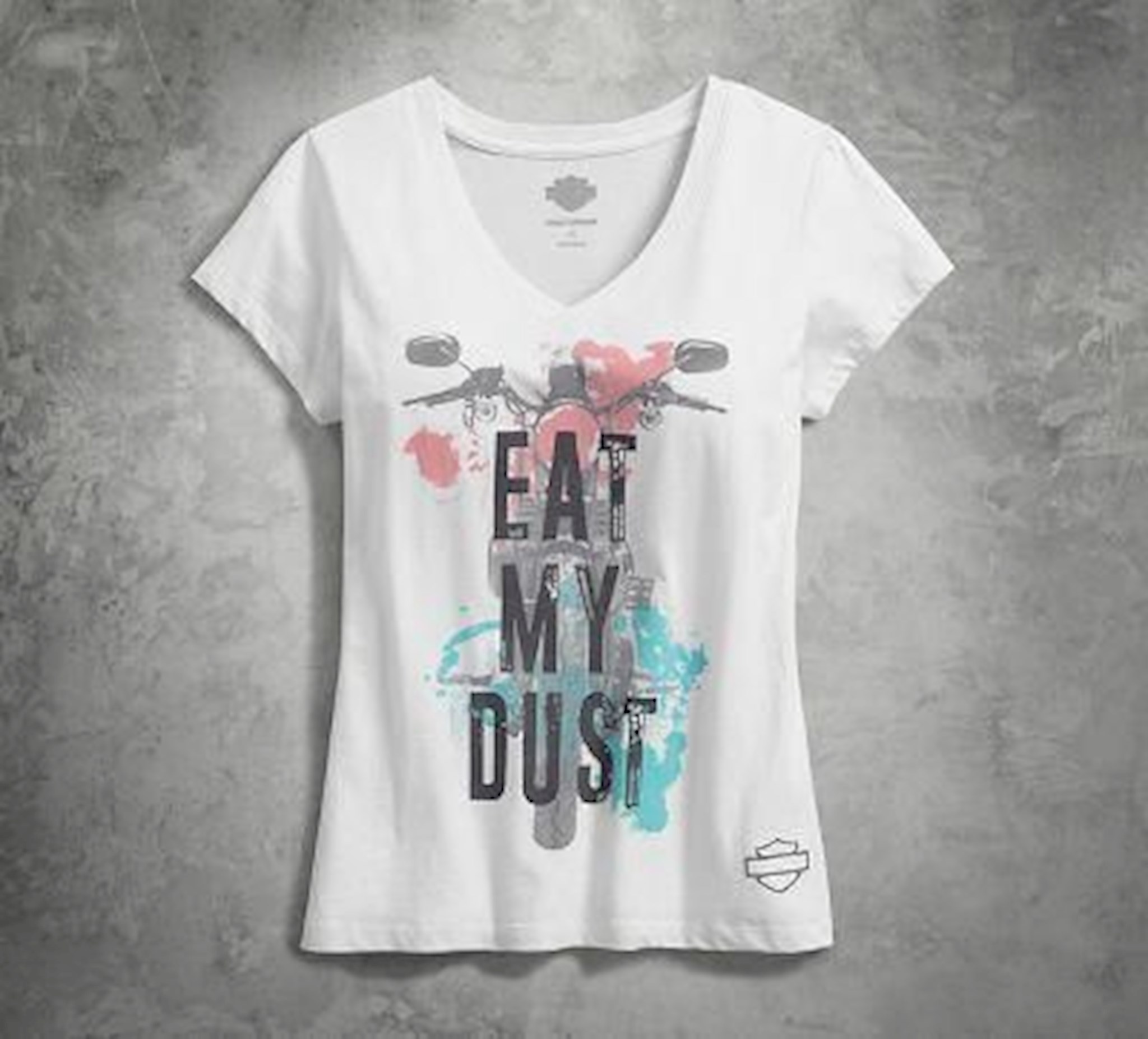Harley-Davidson® Women's Eat My Dust V-Neck Tee, 96102-18VW. Made of 100% cotton jersey. Rib-knit neckline. Distressed printed graphics on front.