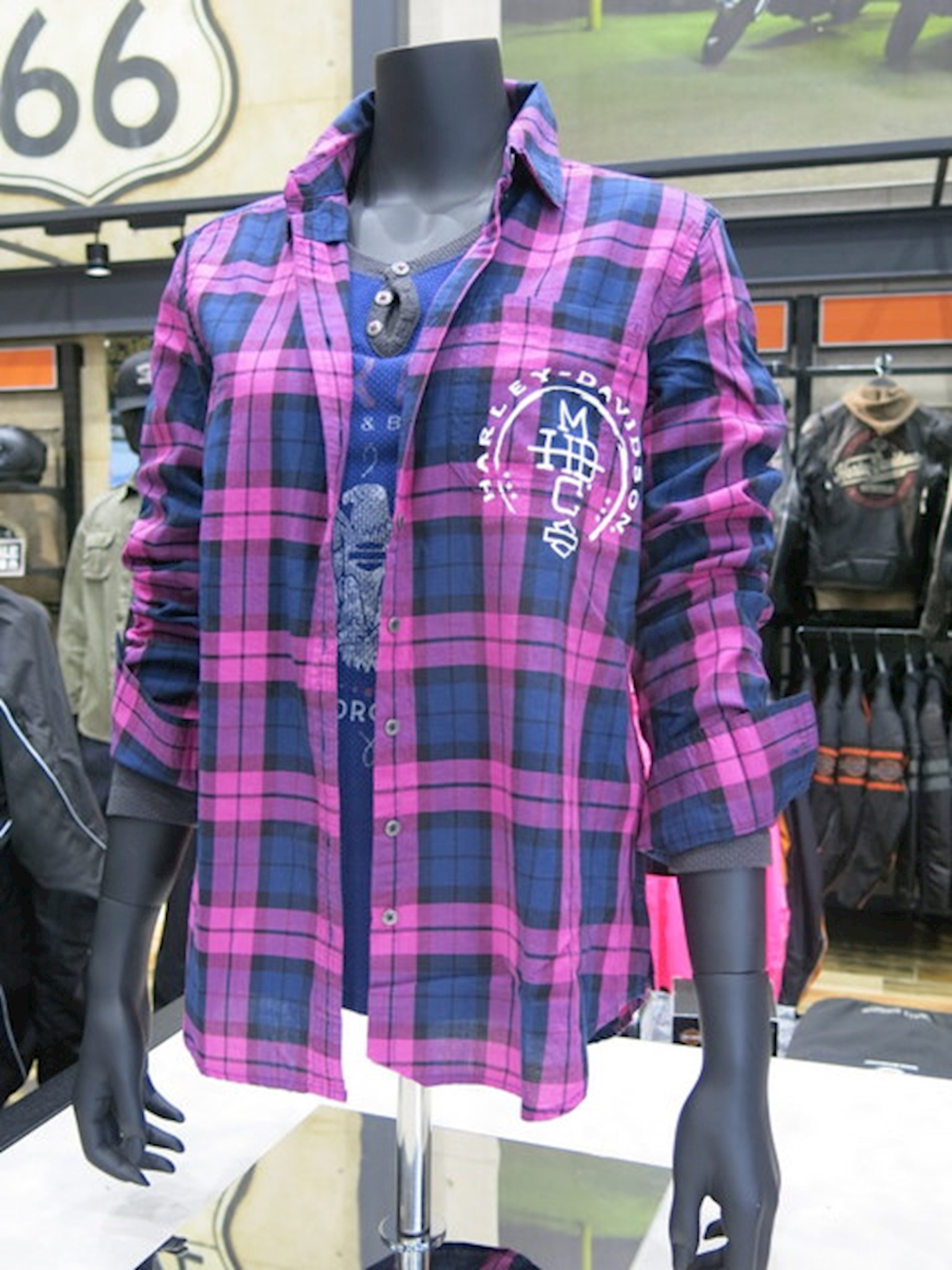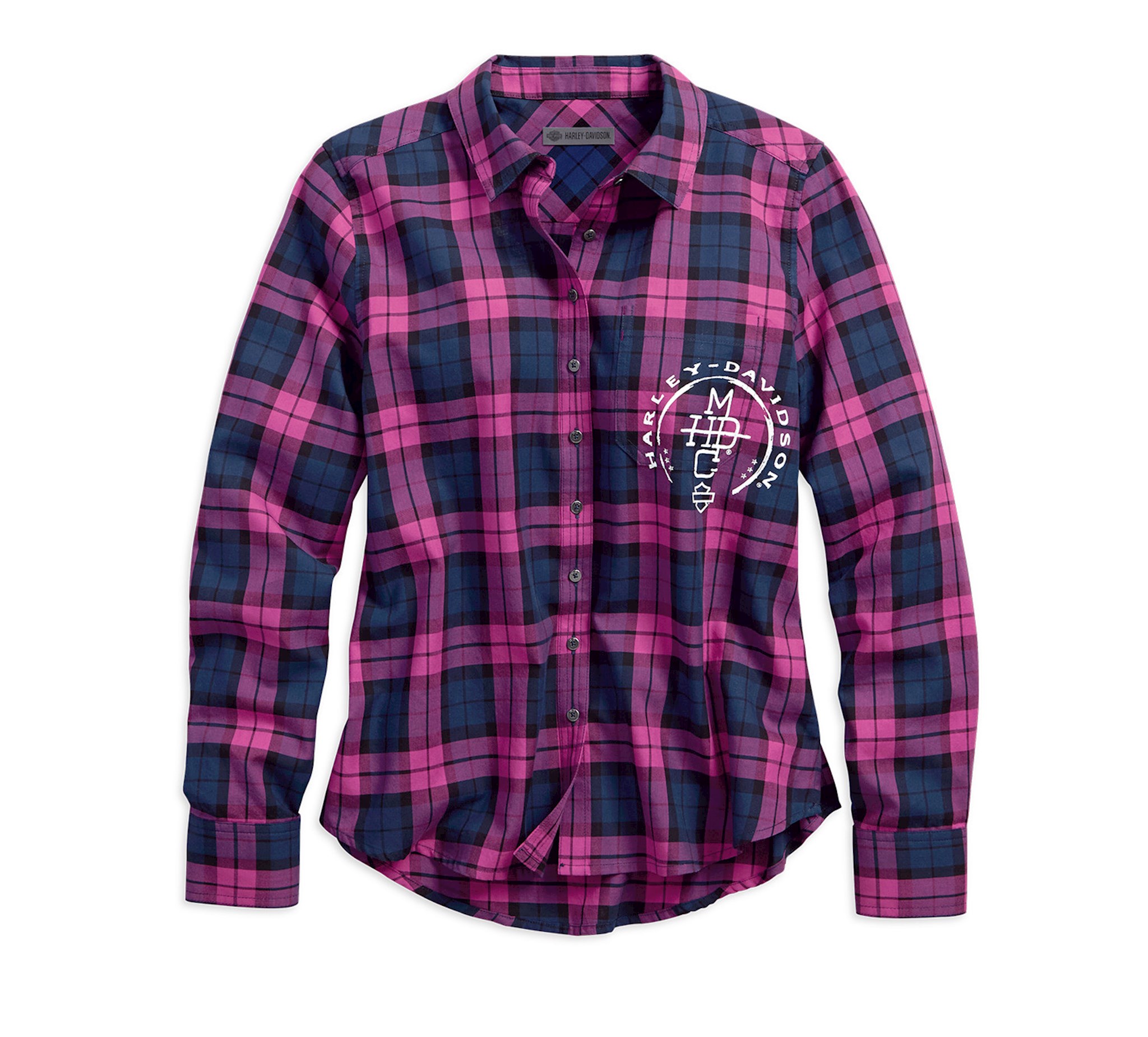 The 100% cotton Stacked HDMC Shirt is a key player this season. Versatile enough to stand on its own or wear it unbuttoned over a tank when temps are cool. Washed for a soft touch, this women's long sleeve top comes in a cheerful blue/magenta plaid with low-key pocket graphics. 100% cotton is washed for softness. Button front and cuffs. Chest pocket. Distressed printed graphics on chest pocket.