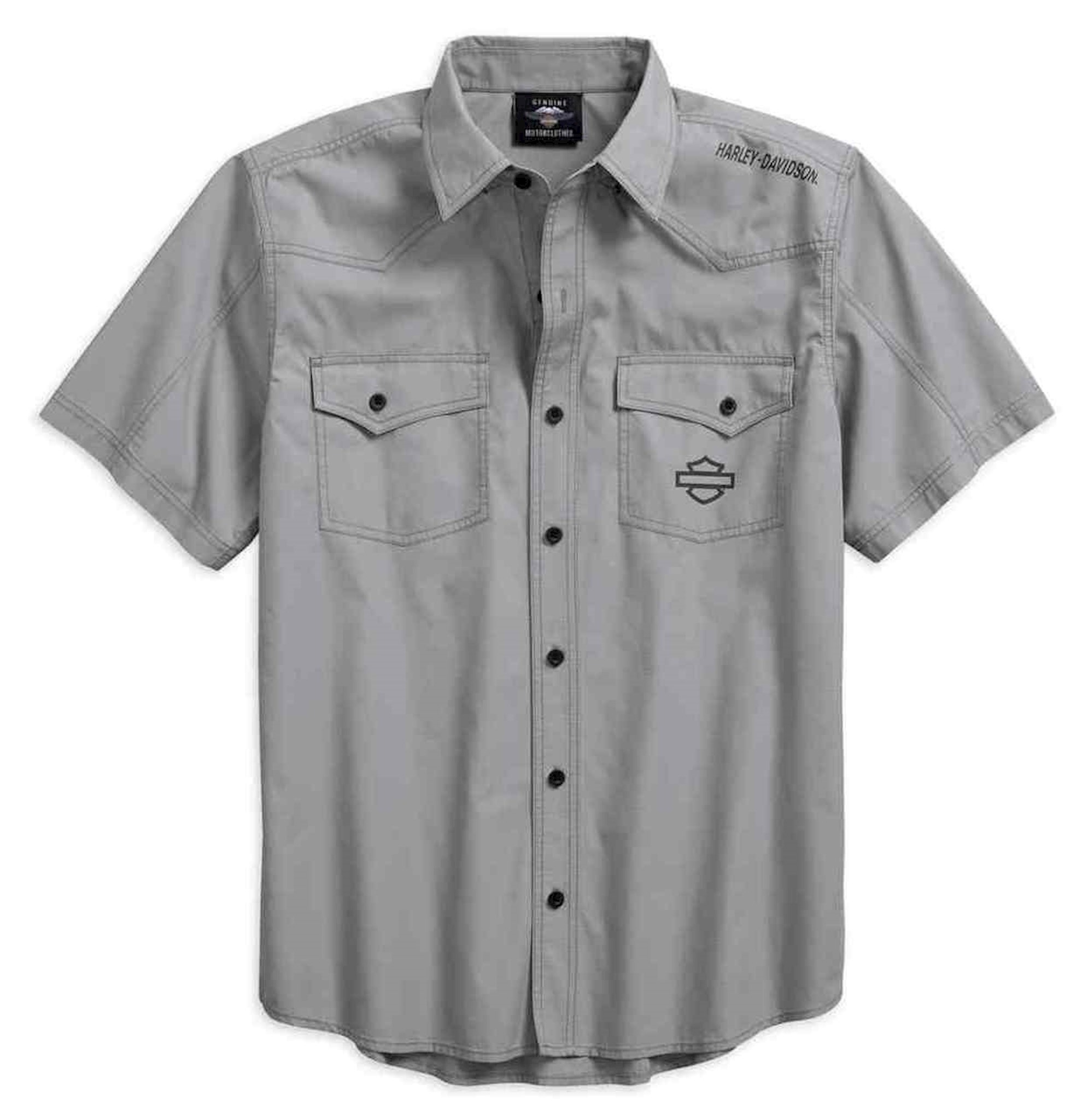 Harley-Davidson® Men's Ripstop Shirt, 96186-18VM. Made from 100% cotton ripstop that is washed for softness. Button front. Snap-down collar. Two button flap chest pockets. Printed graphics on left pocket and front yoke. Printed patch on back yoke. Try this men's short sleeve shirt on your next tour.
