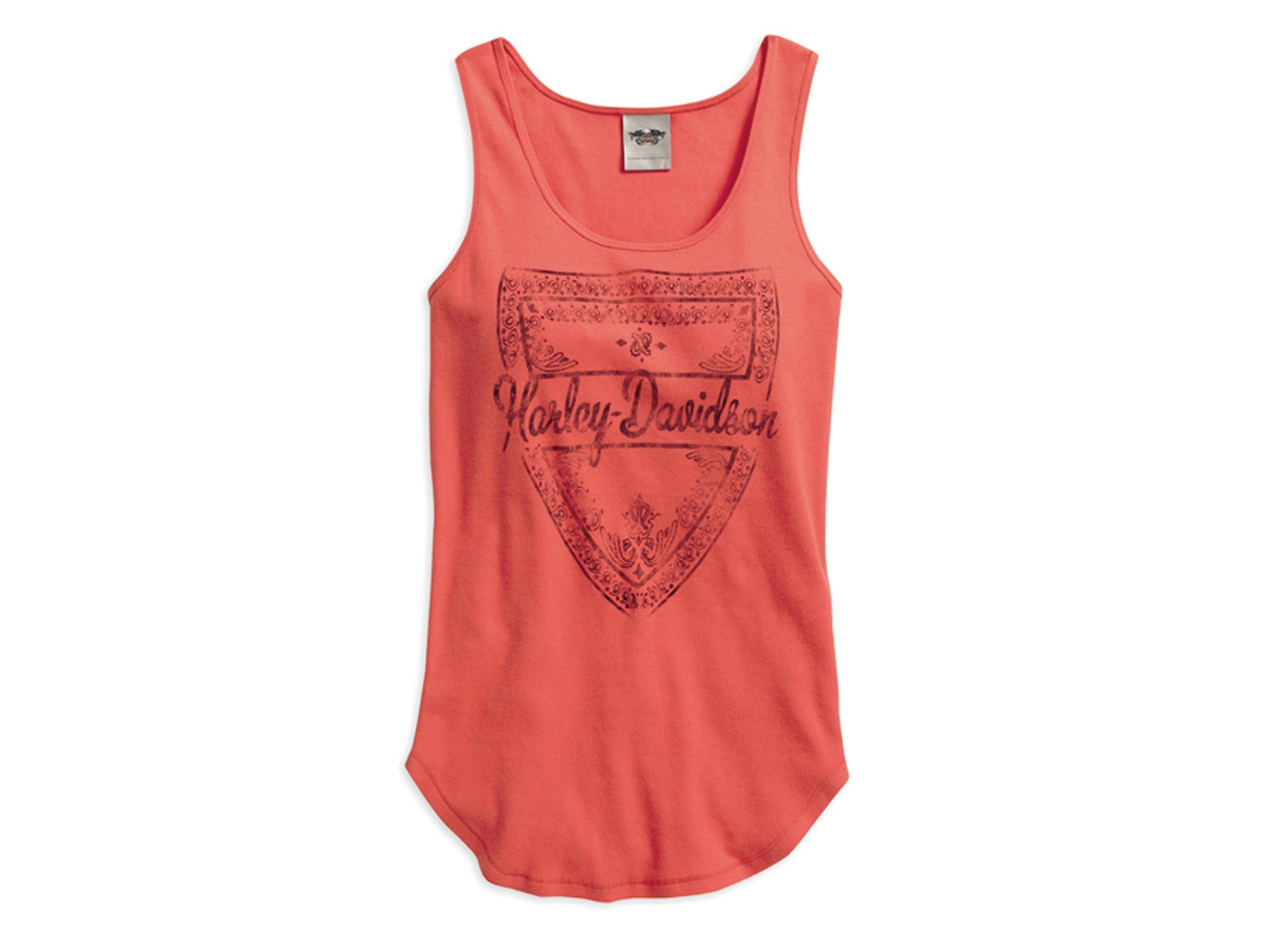 Harley-Davidson® Women's Bandana Print Sleeveless Tank Top, 96240-16VW. Made of 97% cotton and 3% spandex. 2x1 rib. Scoop neck. Raw-edge hem. Printed graphics on front.
