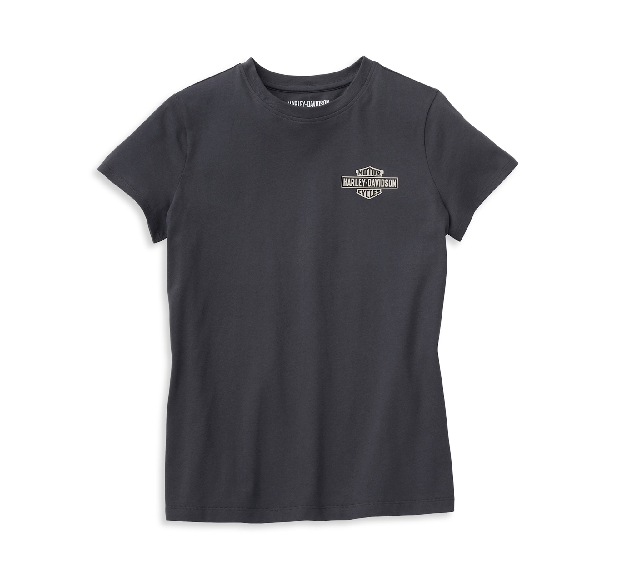 Spotlight your H-D® pride with this tee. We take top quality, hard-wearing 100% cotton jersey and treat it to two-sided art. The front features a low-key print of the Bar & Shield logo while the back showcases stealthy, tonal art. Great with skinny jeans, leggings, or a leather skirt.