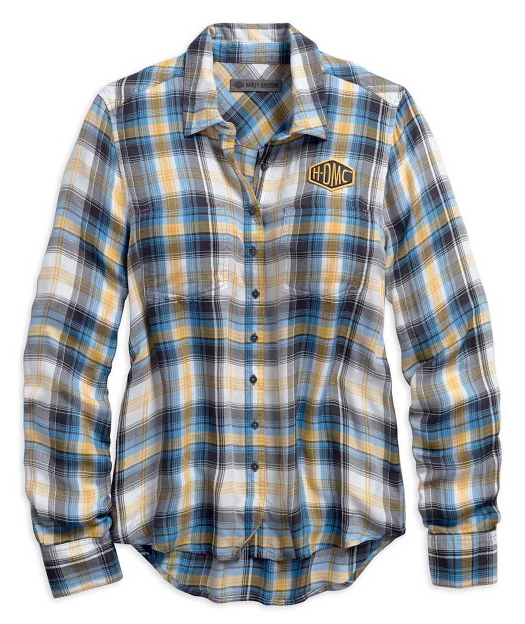 Harley-Davidson® Women's HDMC Long Sleeve Plaid Shirt, 96248-18VW. Made from 100% rayon that is washed for softness. Button front and cuffs. Two chest pockets. Embroidered patch on left chest. Lightweight, flowing rayon is washed for maximum softness. And the fresh blue/gold plaid layers great over a tank or tee.
