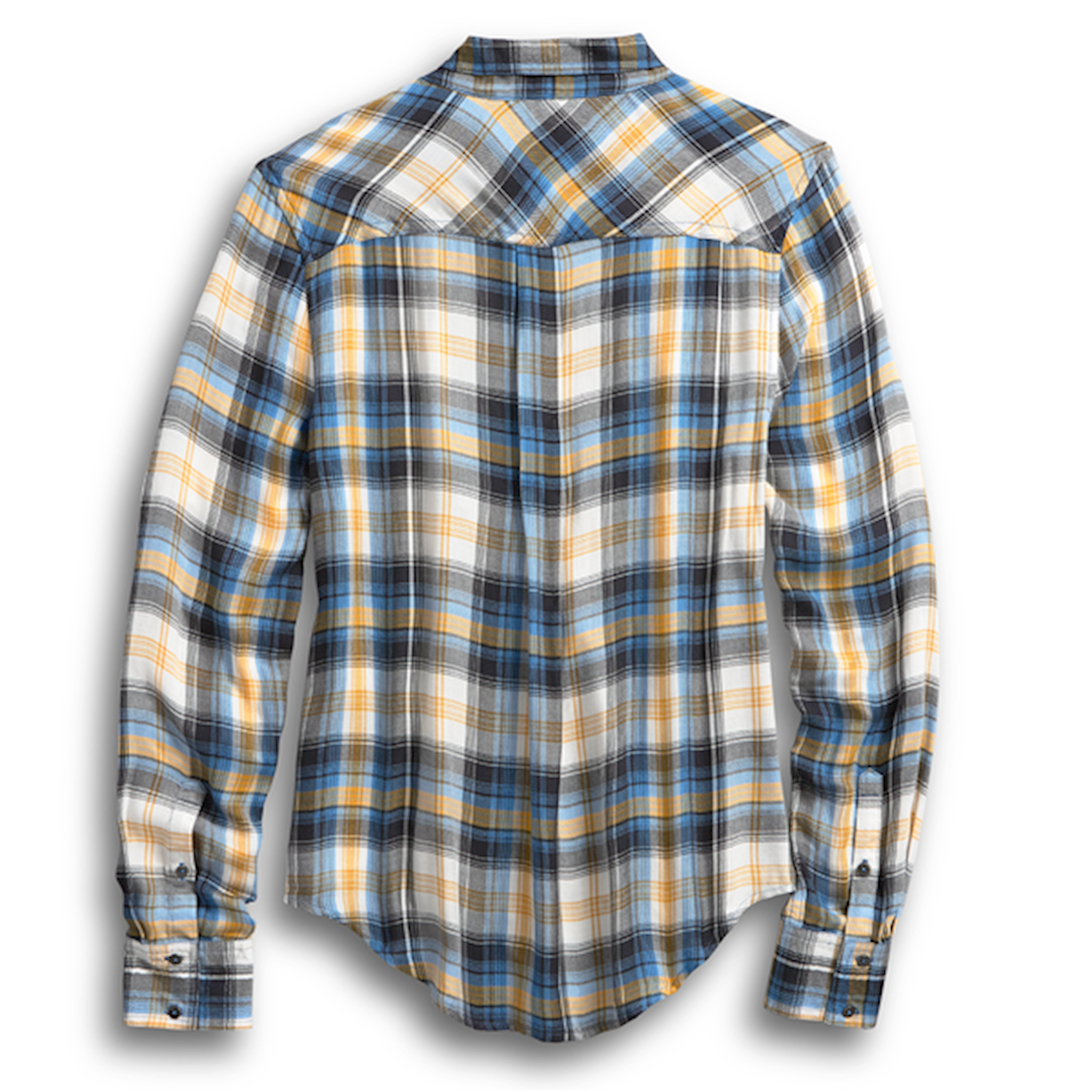 Harley-Davidson® Women's HDMC Long Sleeve Plaid Shirt, 96248-18VW. Made from 100% rayon that is washed for softness. Button front and cuffs. Two chest pockets. Embroidered patch on left chest. Lightweight, flowing rayon is washed for maximum softness. And the fresh blue/gold plaid layers great over a tank or tee.
