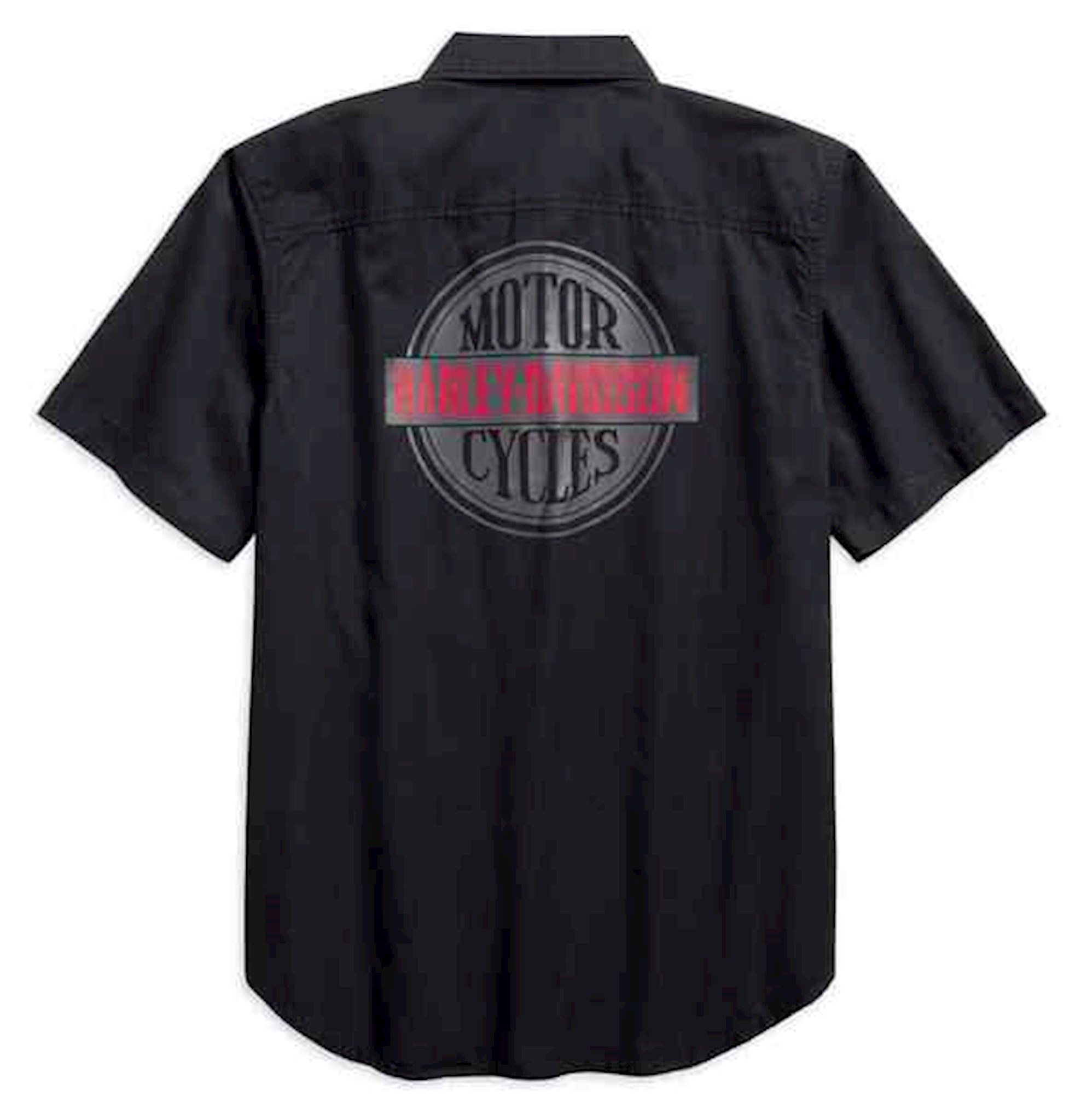Harley-Davidson® Men's Big Back Graphic Shirt, 96252-18VM. Enzyme washed, this cotton twill men's short sleeve shirt is pre-loaded with a lived-in feel that will last for seasons to come. Made from 100% cotton twill with heavy enzyme wash. Button front. Snap-down collar. Two chest pockets. Printed graphics on left chest and back.