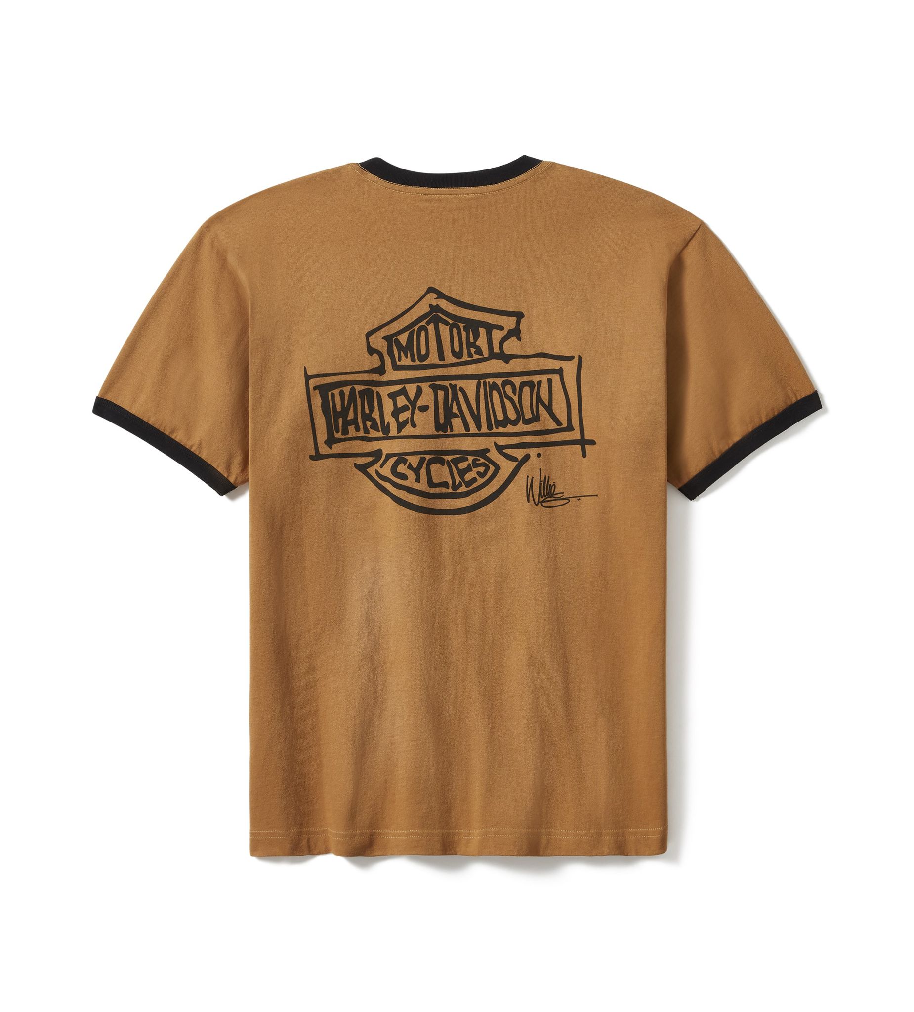 This favorite casual look shares a lane with a creative legacy in the Willie G Bar & Shield Sketch Art Ringer Tee. Its relaxed fit is cut from heavyweight cotton jersey that’s enzyme washed for a well-worn look and feel. True to a ringer silhouette, this unisex t-shirt features a contrast neckline and cuffs. It showcases genuine Willie G style inspired by our most notable Bar & Shield. Part of the Willie G Sketch Collection of authentically made in USA garments that feature hand-drawn and signed artwork by our iconic designer, Willie G. Davidson.