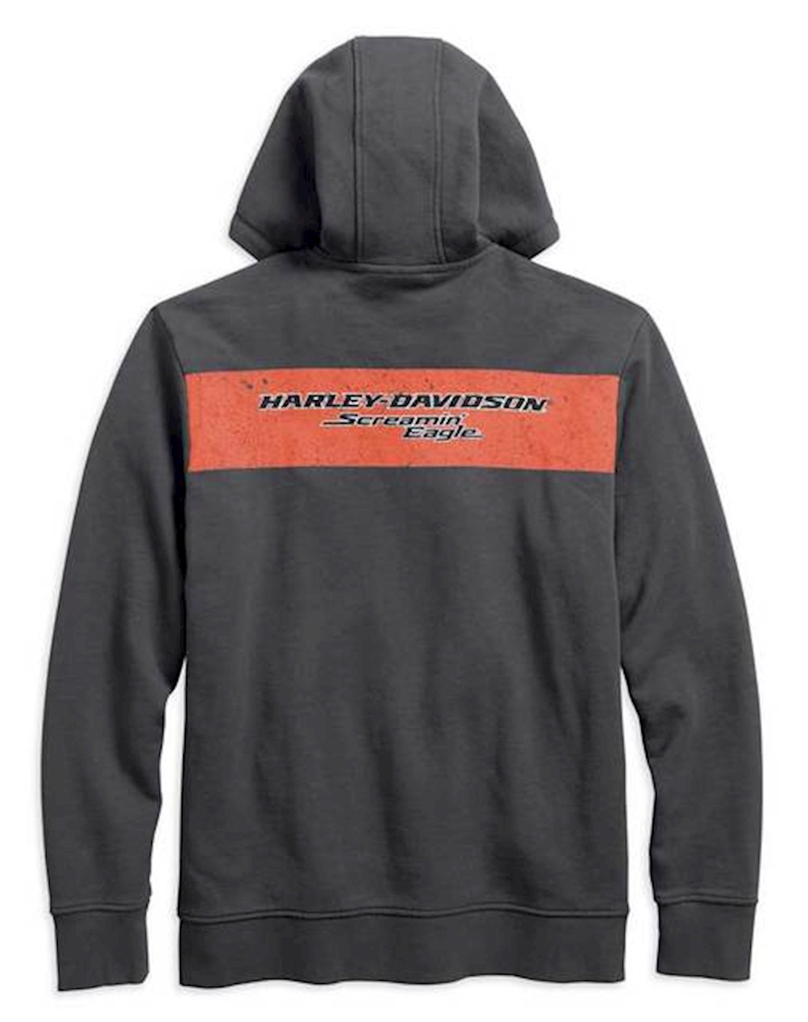 Harley-Davidson® Men's Screamin' Eagle Hoodie, 96274-18VM. Made from 100% cotton French terry with heavy enzyme wash. Zipper front with lined drawstring hood. Rib-knit cuffs and waist. Two hand-warmer pockets. Embroidered graphics on right chest and distressed printed graphics on back.