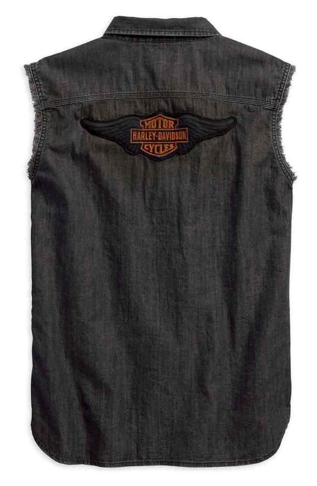 Harley-Davidson® Men's Sleeveless Denim Slim Fit Shirt, 96286-18VM. Made from 100% cotton denim with heavy enzyme and stone wash for lightweight feel and lived-in look. Button front. Snap-down collar. Two button flap chest pockets. Coated embroidered patches on right chest and back. Slim Fit that is narrower throughout.
