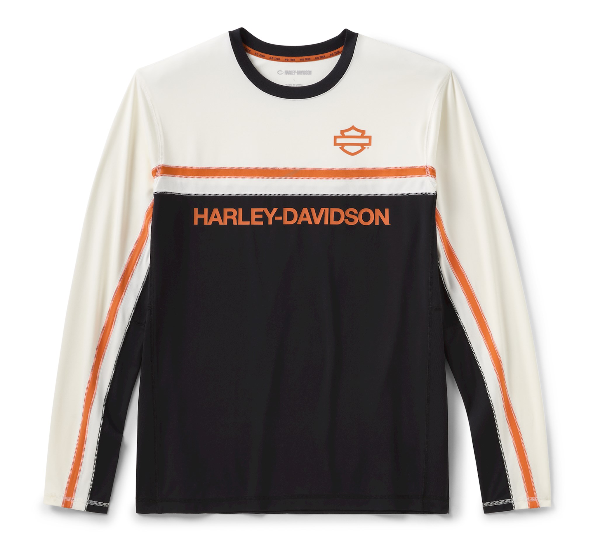 Try a new style and comfort route with our H-D® TECH Color Block Vented Long Sleeve Crew. Crafted from a polyester/spandex jersey blend, it delivers stay-cool comfort with mesh underarms, side panels, and back panel venting. It also delivers an elevated look with its colorblock styling and high-density print of our contemporary branding on both sides.