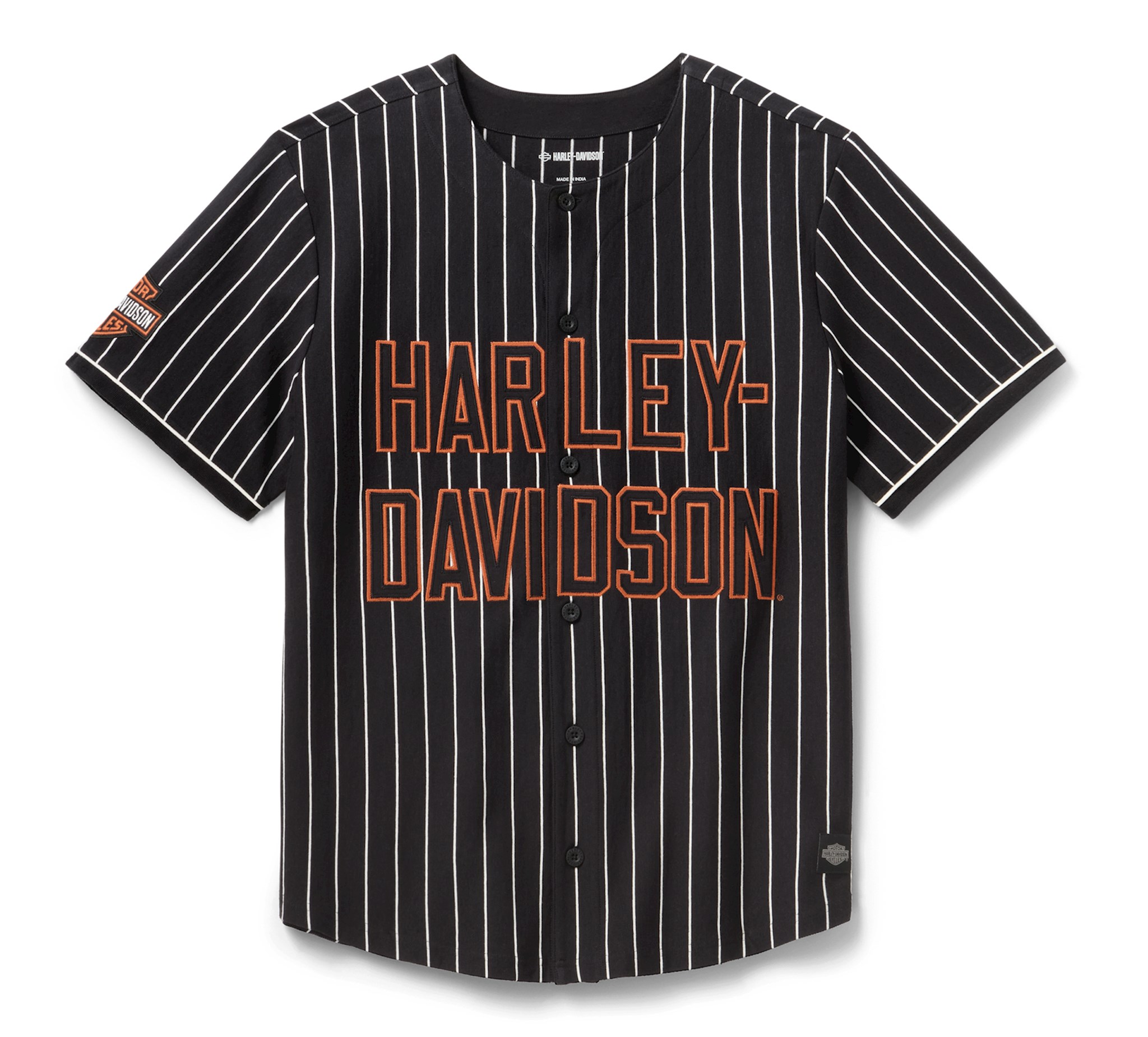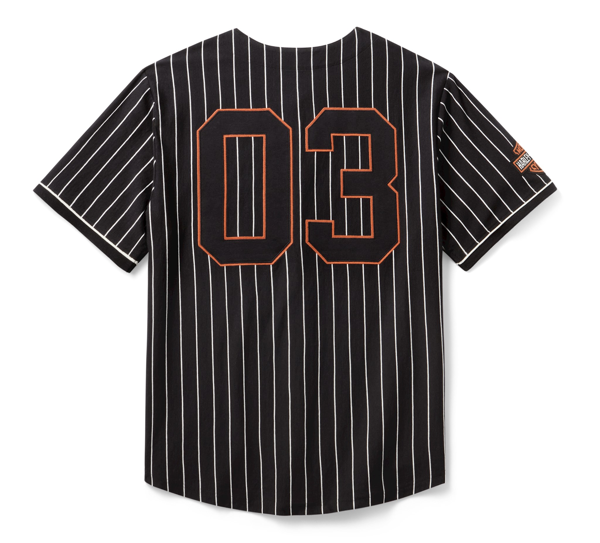 Sportieve H-D-stijl slaat een homerun in de H-D® Essential '03 Baseball Jersey. Hij is duurzaam maar ademend gemaakt van zwaargewicht katoen met pinstriped jersey en een merkknoop aan de voorkant. De contraststyling en graphics komen samen voor een blijvende look die onze oprichtingsdatum in 1903 en onze motor legacy eert.
