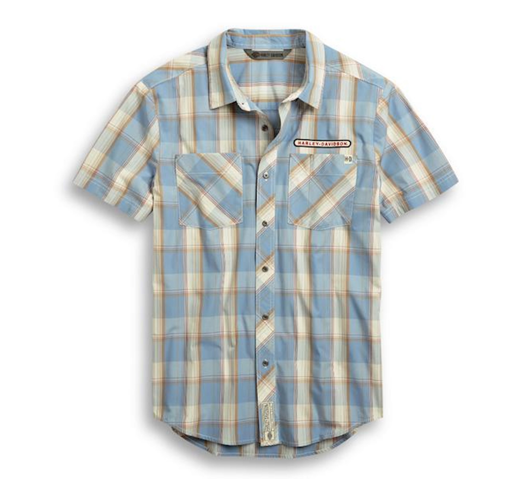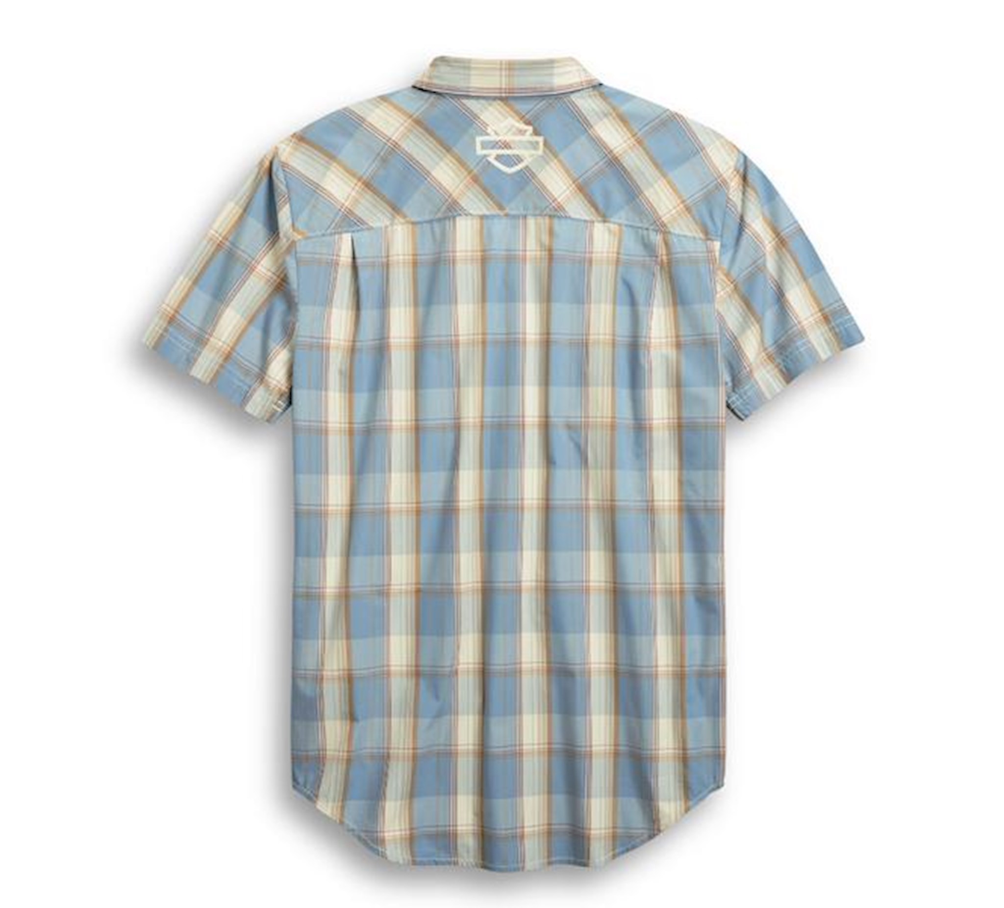 The Plaid Woven Shirt is like an old favorite thanks to the vintage inspired pattern. It features baby blue plaid with a fine red grid as an accent color—great to pick up the red in the embroidered patch. This men's short sleeve shirt is designed from lightweight cotton poplin with a slim silhouette to fit closer to the body.